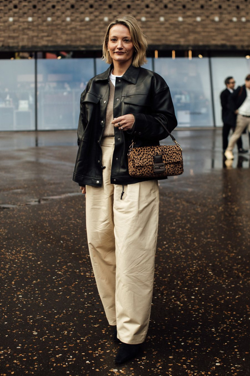 Кожаная куртка оверсайз в сочетании с широкими светлыми брюками - идеальный пример городской капсулы на межсезонье. Леопардовая сумка добавляет необходимый модный акцент и оживляет нейтральную палитру.