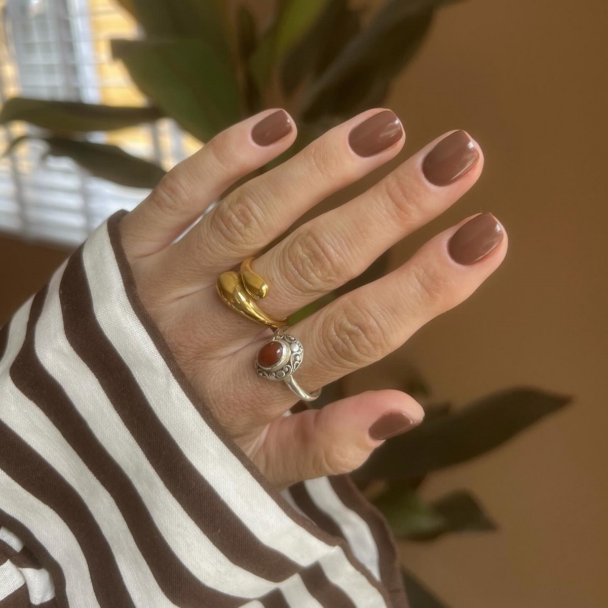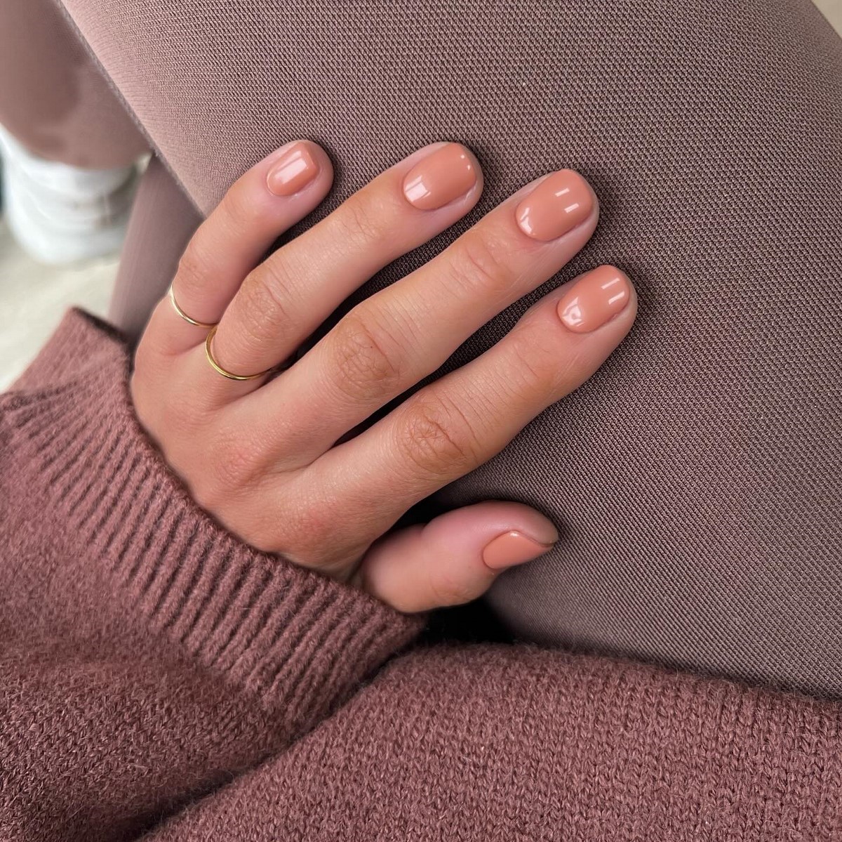 Если хочется тепла, но без розового, карамельный нюд почти беспроигрышен. Он визуально сглаживает тон кожи и добавляет мягкости.