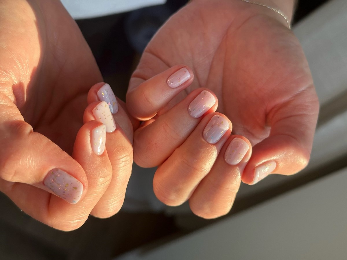 Перед светлыми весенними оттенками очень помогает выравнивающая база. Она делает поверхность гладкой, а цвет, более плотным и чистым. Именно это чаще всего отличает “салонный” вид от домашнего.