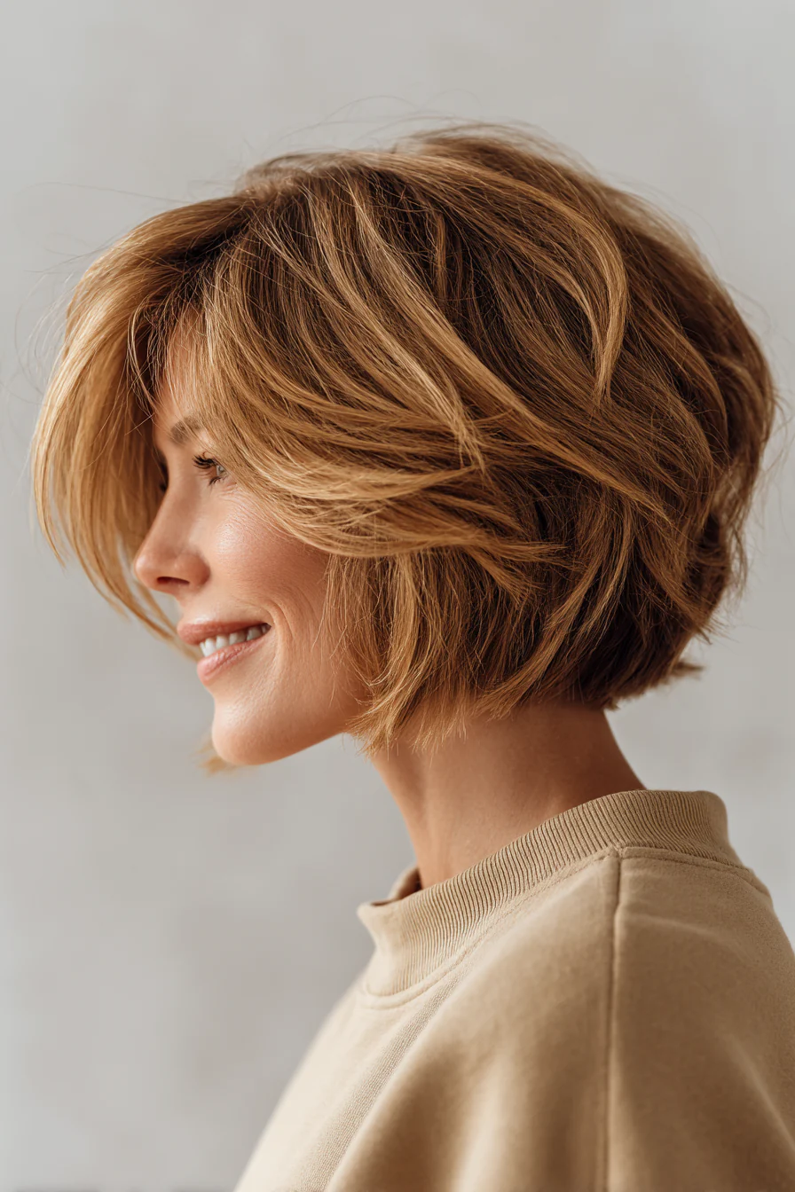 Лёгкие «перышки» вокруг лица работают как мягкий фильтр: смягчают скулы и линию щёк. Тонкие золотистые блики добавляют объём и подсветку, без ухода в тотальный блонд.