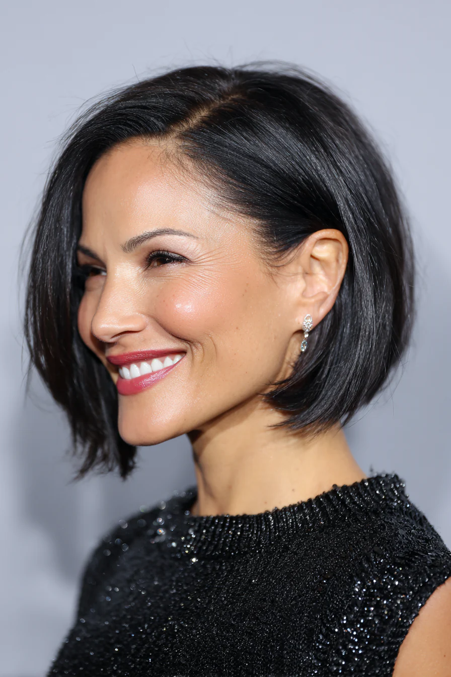 Глубокий боковой пробор даёт мгновенный лифт у корней и маскирует «плоскость» макушки. Мягкий чёрный, не угольный, а более натуральный, добавляет графики, но не утяжеляет образ.