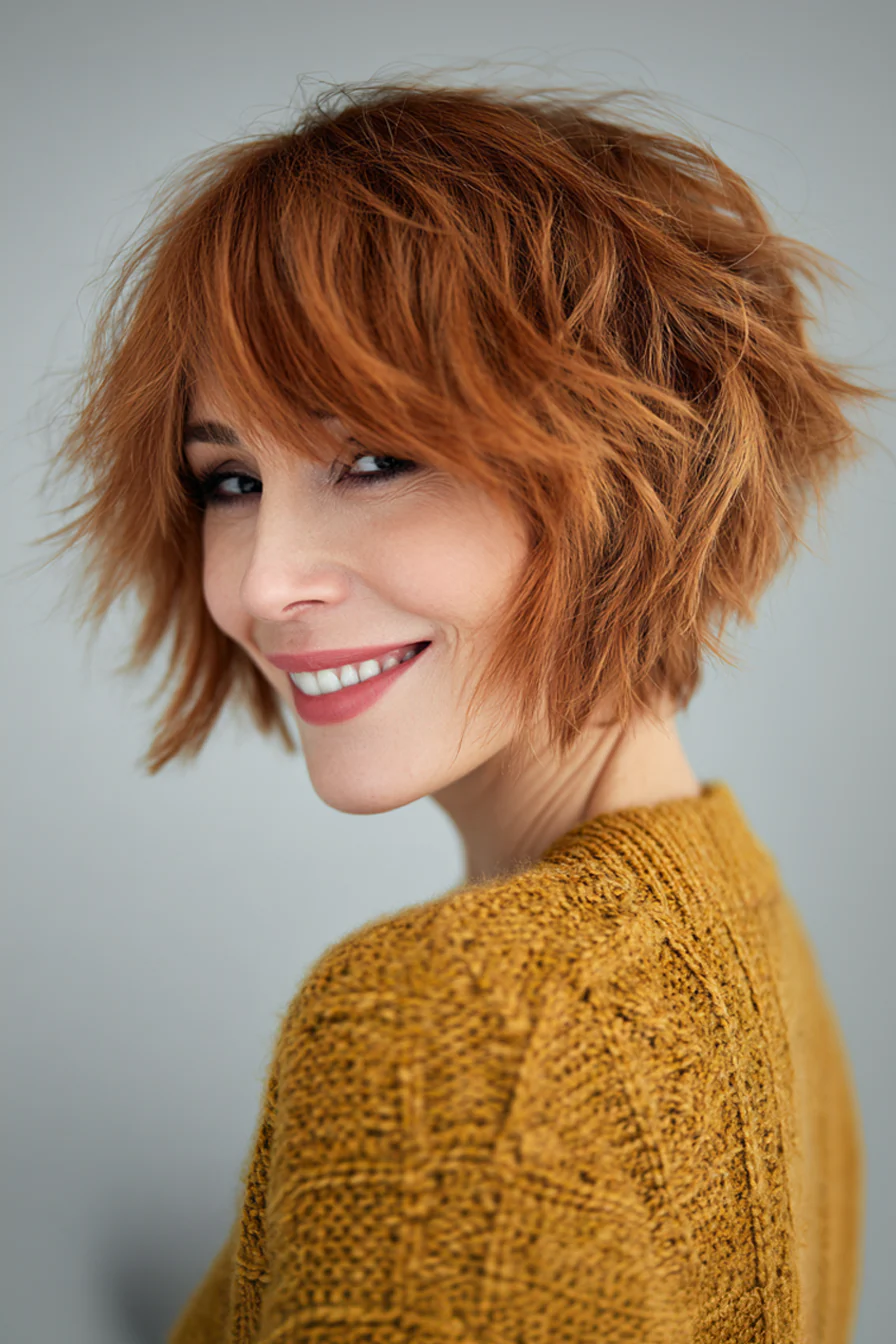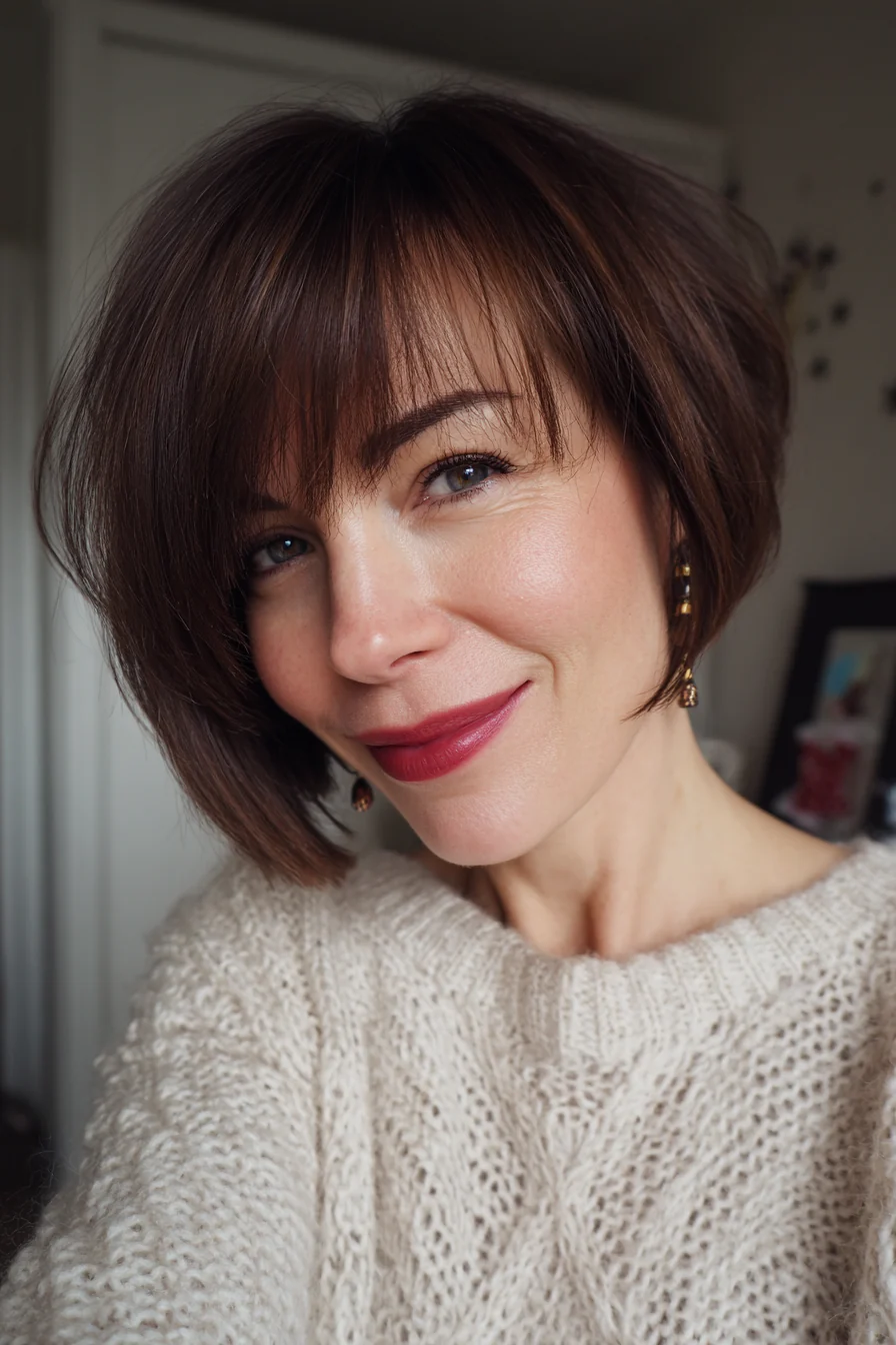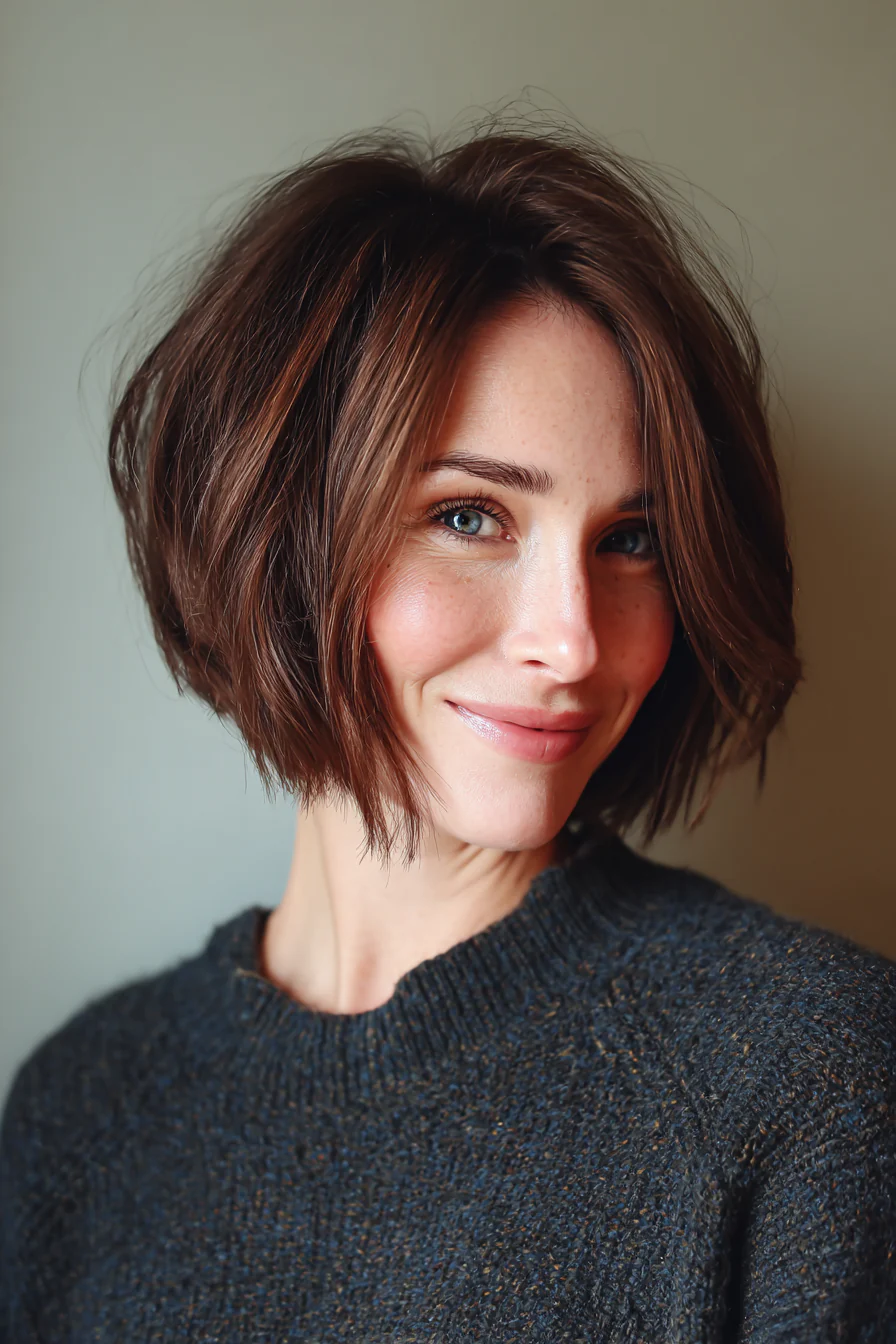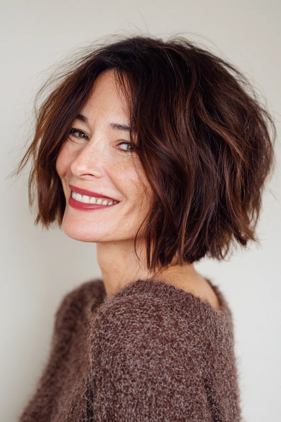 Лёгкая градуировка на затылке добавляет объём и делает силуэт аккуратным, даже если волосы тоньше, чем раньше. Тёплый каштан «поднимает» цвет лица и часто делает макияж визуально легче.
