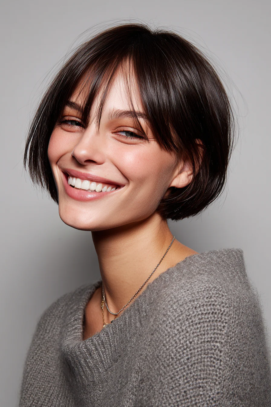 Чёлка-шторка мягко закрывает лоб, но не «режет» лицо, за счёт этого образ выглядит свежее. Коричный шатен даёт тёплую глубину и эффект «живого» цвета.