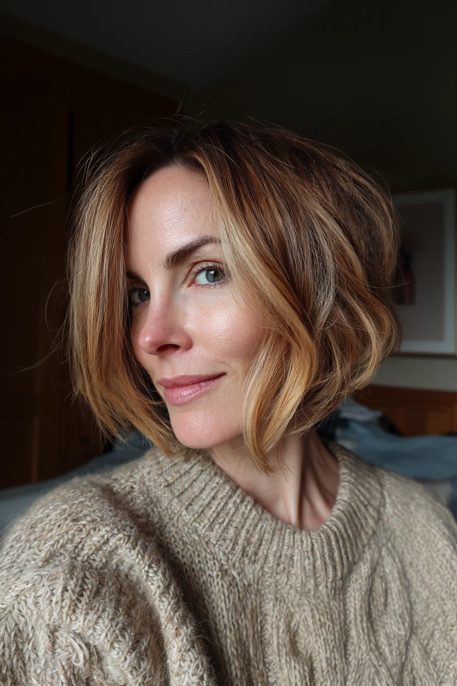Передние пряди чуть длиннее, за счёт этого лицо кажется более вытянутым, а линия подбородка более чёткой. Карамельный балаяж даёт мягкий контраст без жёстких границ, отрастает красиво и не требует постоянной коррекции.