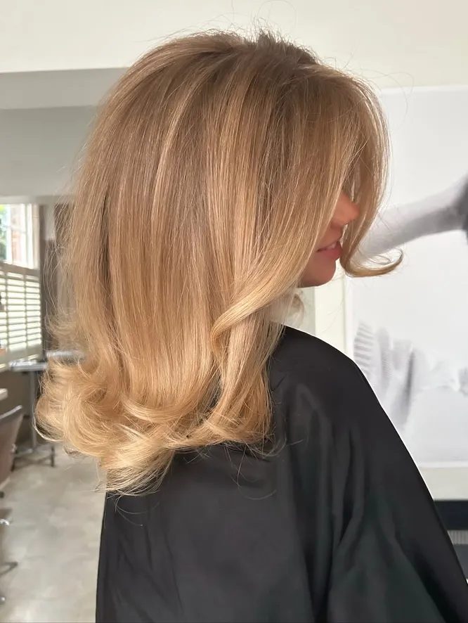 Золотой блонд держится на теплом свечении: в нем смешиваются светлые и карамельные нюансы, из-за чего волосы кажутся объемнее и плотнее. Переливы работают как мягкий фильтр, добавляют сияние и визуально “смягчают” черты лица.