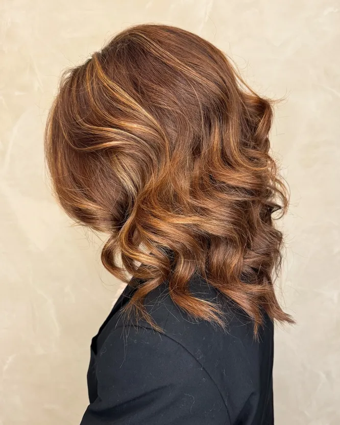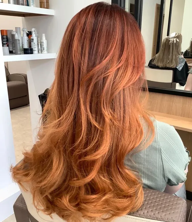 Медный блеск хорош тем, что волосы в нем реально «играют» при любом освещении. Теплый тон ловит свет, за счет этого длина кажется объемнее и гуще. А если добавить пару более светлых прядей у лица, появляется мягкая подсветка, она освежает кожу и аккуратно подчеркивает черты, без резких контрастов.