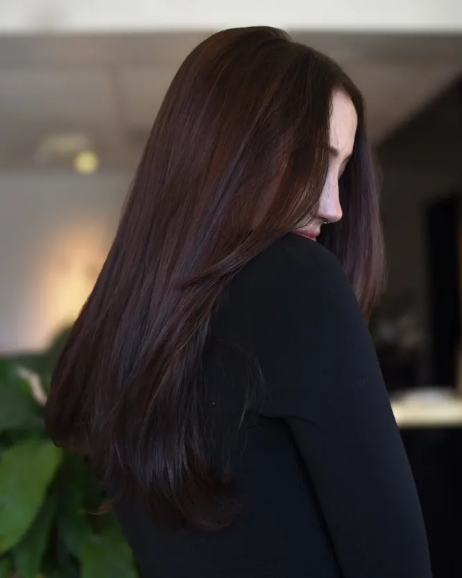 Темный шоколад, классика, которая почти всегда работает на образ. Он подчеркивает гладкость, усиливает глянцевый блеск, и делает волосы визуально более плотными и ухоженными.