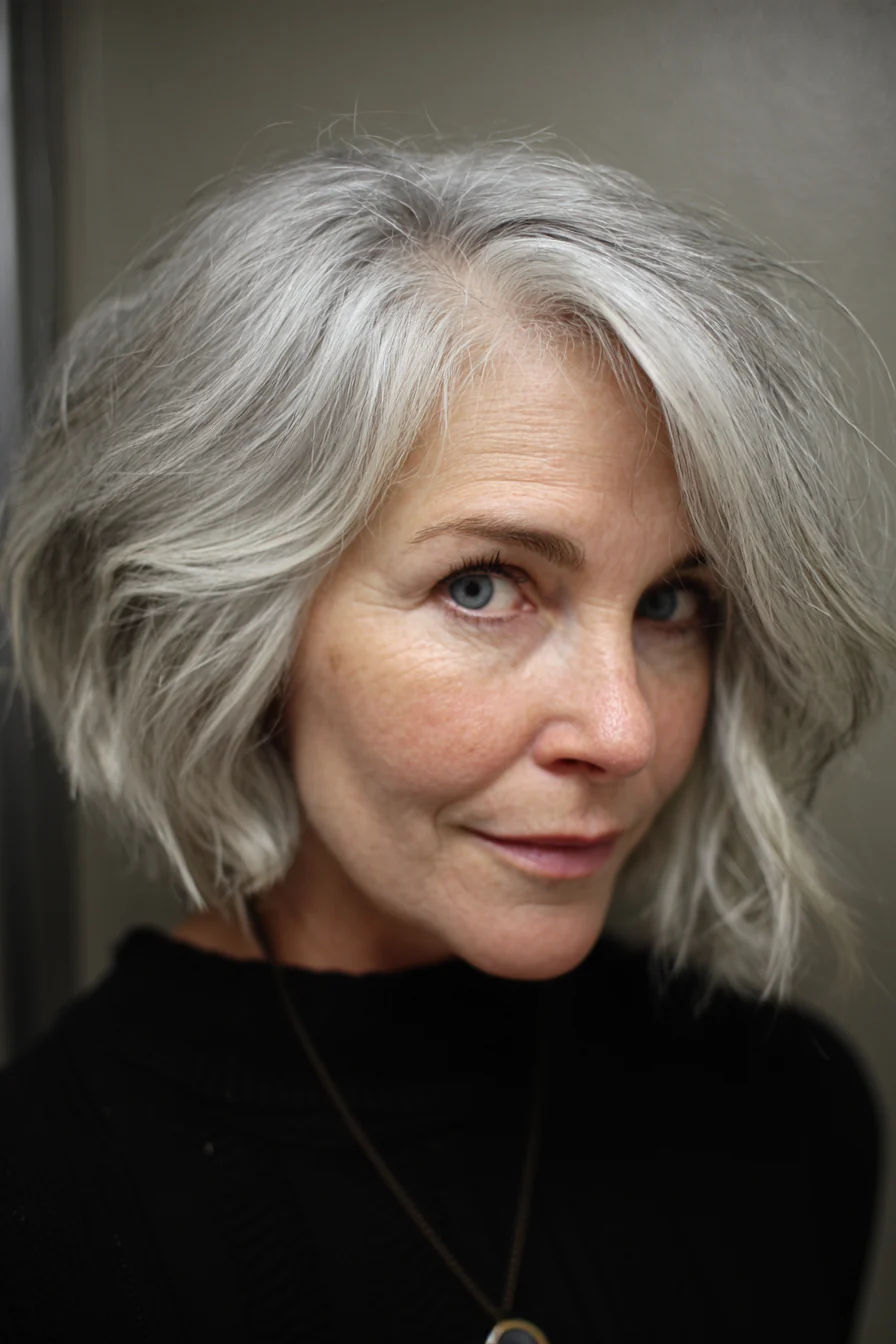 Округлый боб хорошо собирает кудри в форму, подчёркивая их пружину. Серебристый микс, когда седина мягко распределена по длине, делает текстуру визуально более объёмной.