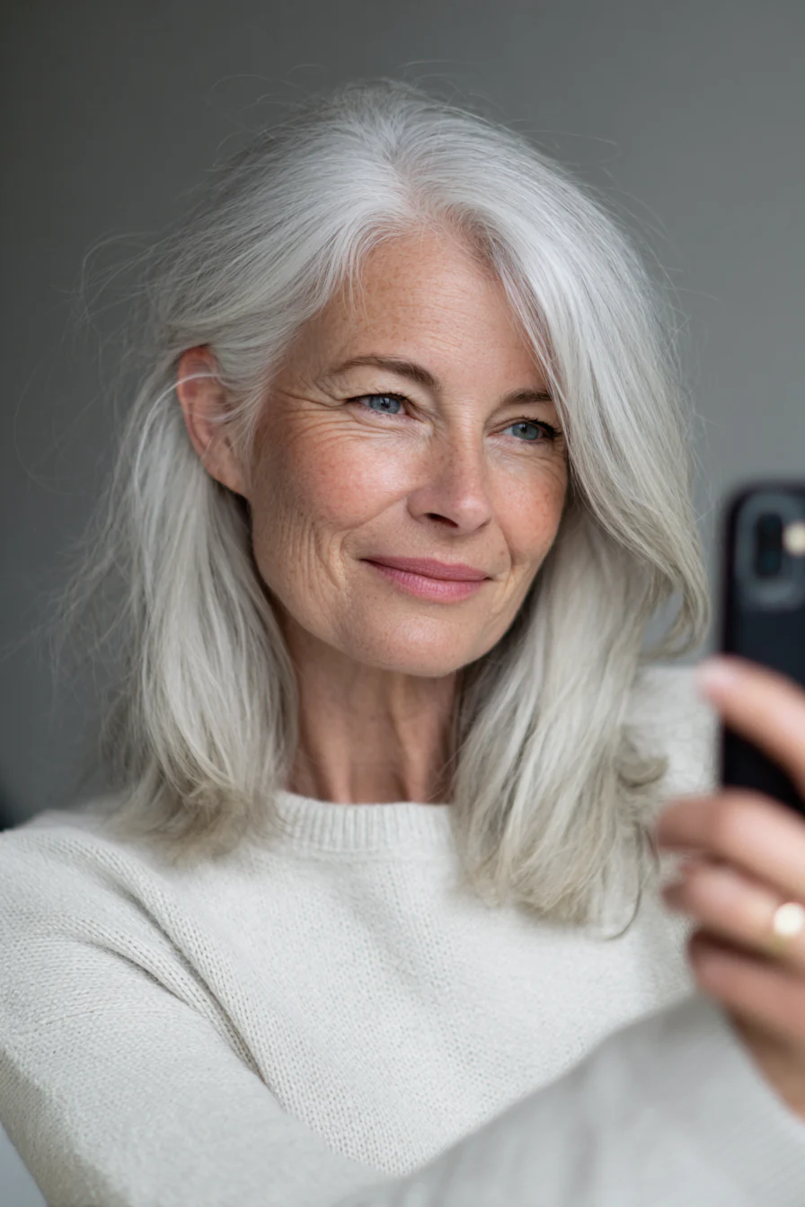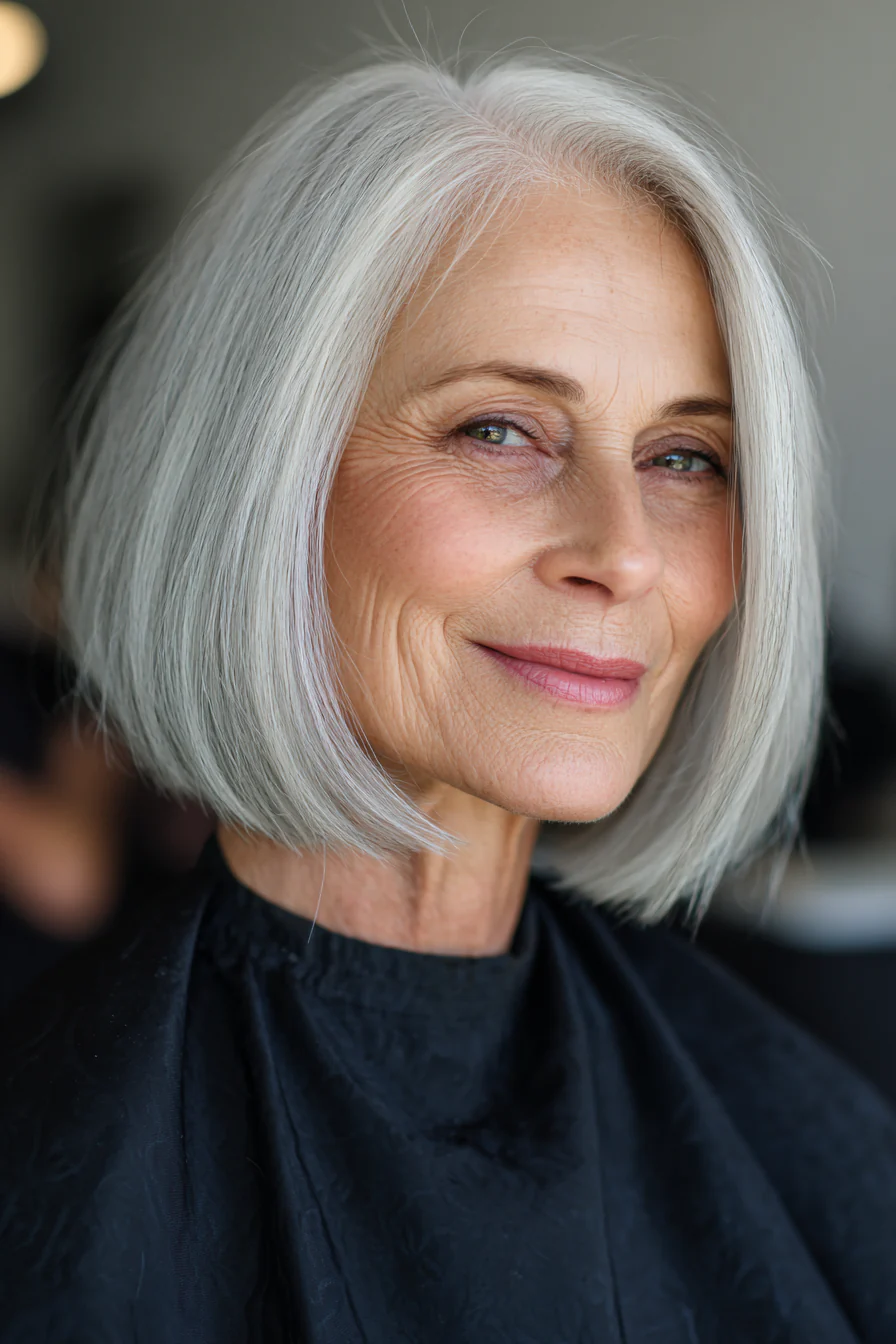 Простая, чистая форма средней длины помогает белой седине выглядеть максимально аккуратно и «дорого». Это вариант для тех, кто любит минимализм и не хочет сложных линий.