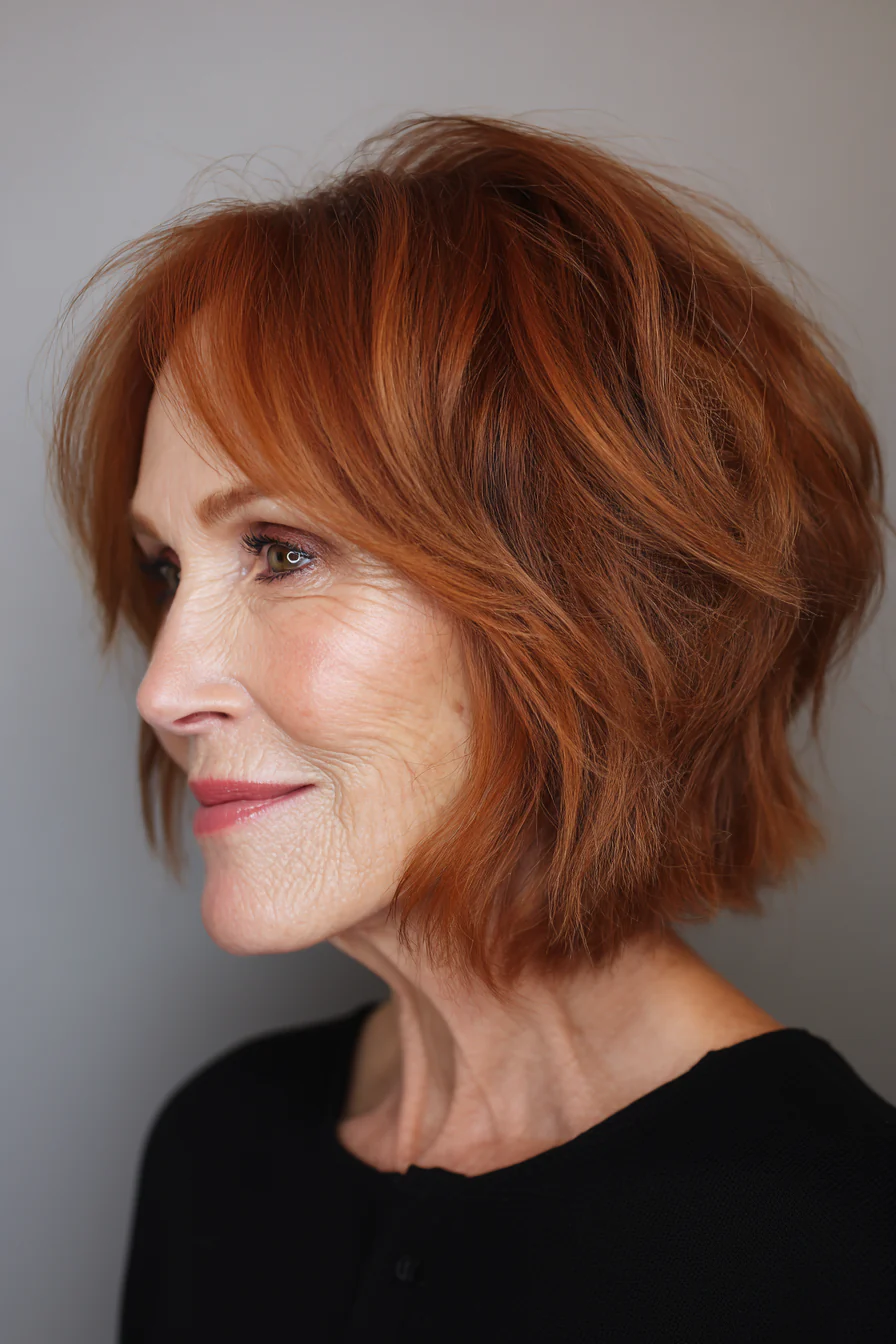 Мягкая перистая текстура добавляет воздушность и смягчает черты. Окрашивание или натуральный эффект «соль с перцем» смотрится дорого и очень естественно.