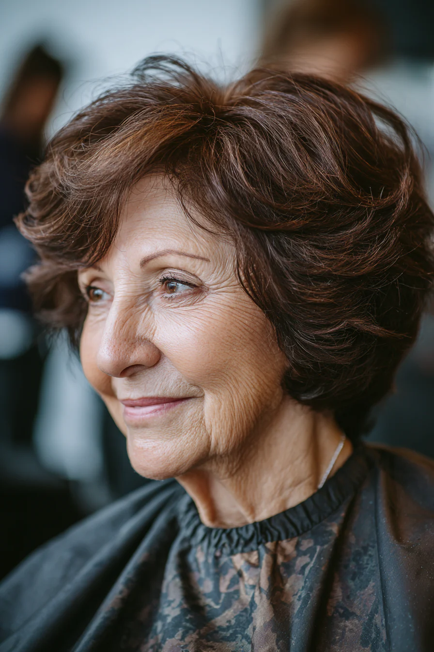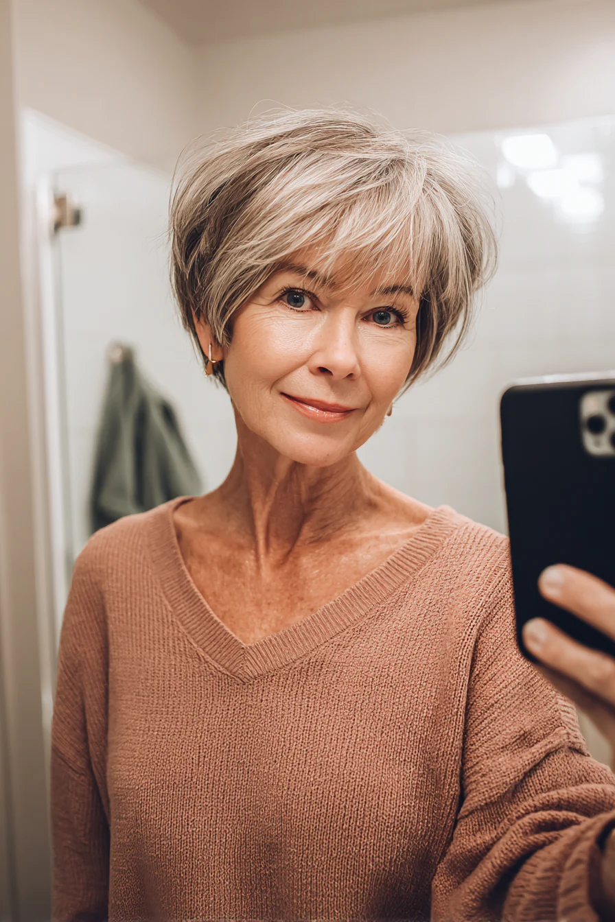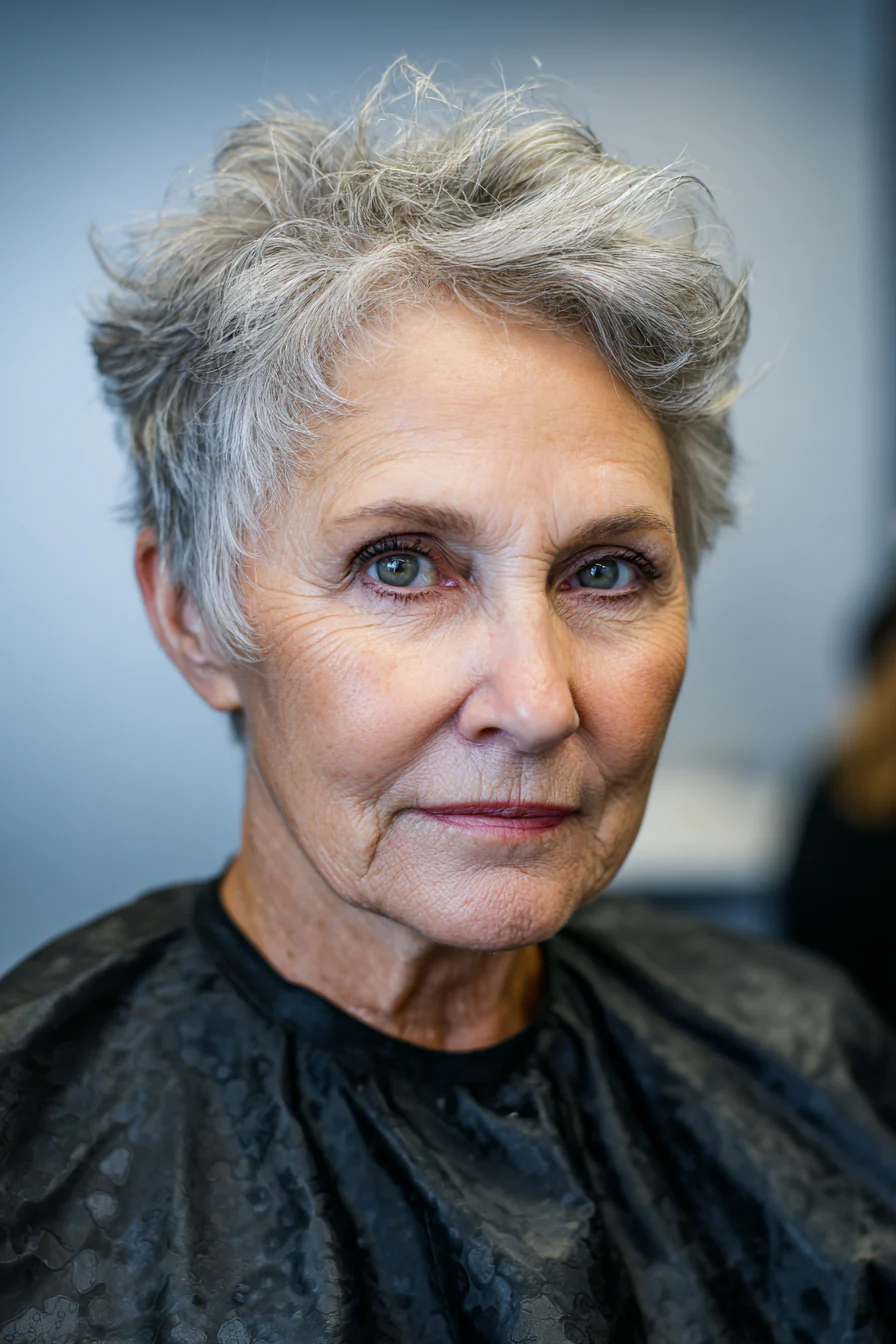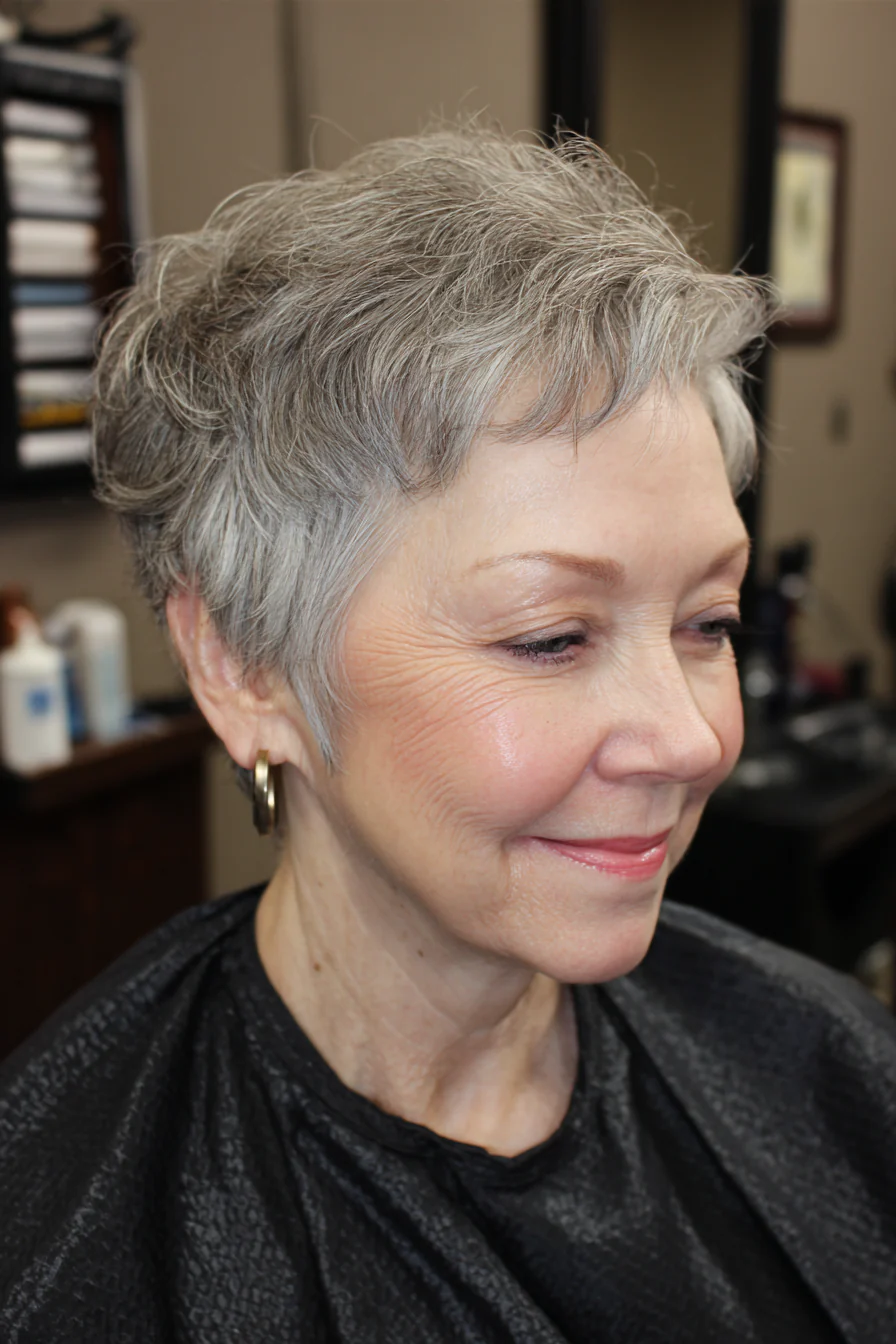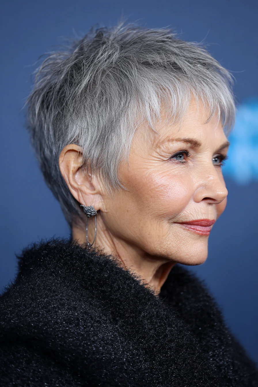 Пикси с более «лохматой» текстурой даёт объём на макушке и выглядит расслабленно. Серые пряди добавляют глубину и делают переходы оттенка мягкими.