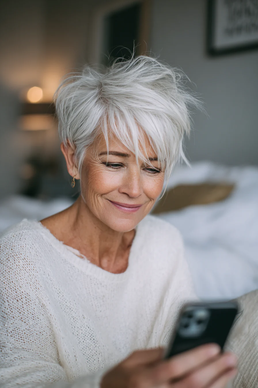 Короткая пикси с мягкими, перьевыми прядями у лица подчёркивает глаза и скулы. Натуральная седина в такой форме выглядит особенно благородно, плюс стрижка легко поддерживается и быстро укладывается.