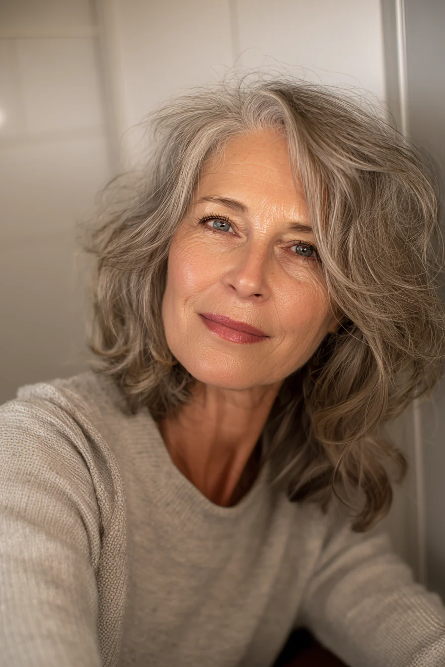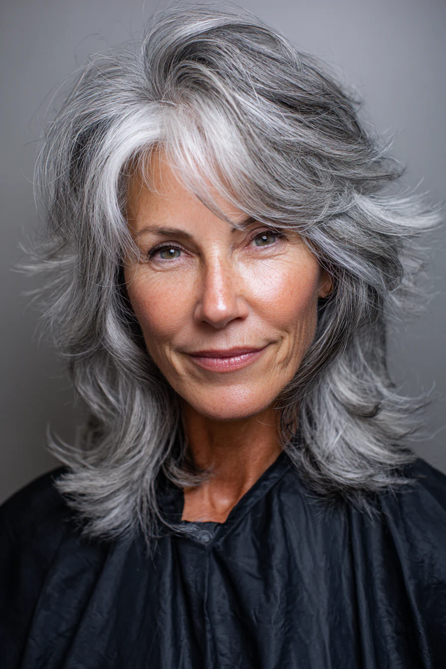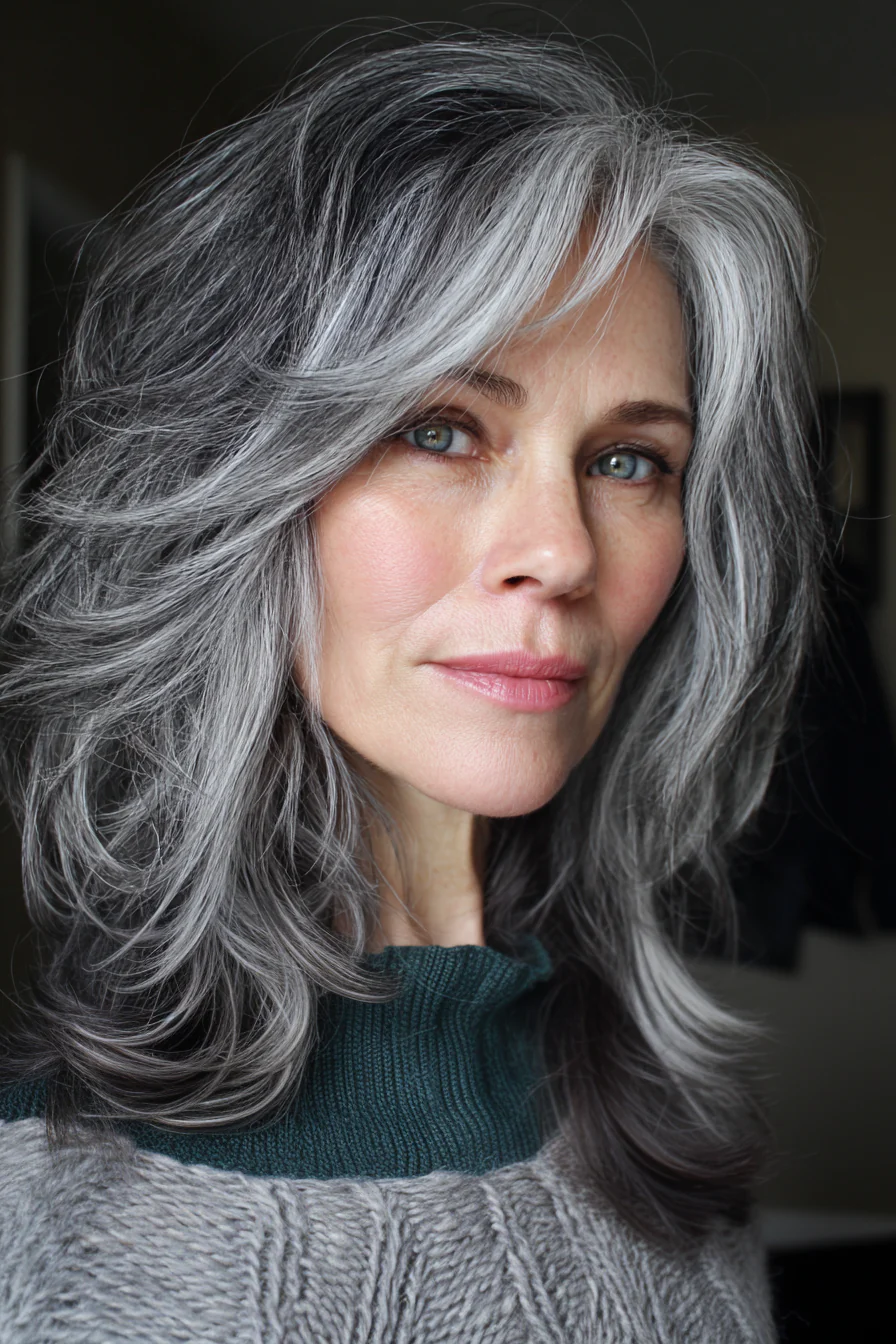 Текстурные слои дают объём по длине и создают тот самый «живой» эффект. Смешение тёмных прядей и седины выглядит естественно, если переходы мягкие и форма сделана правильно.