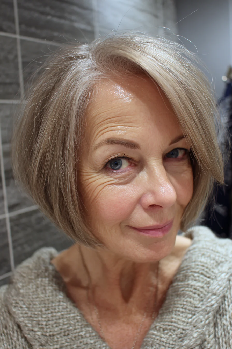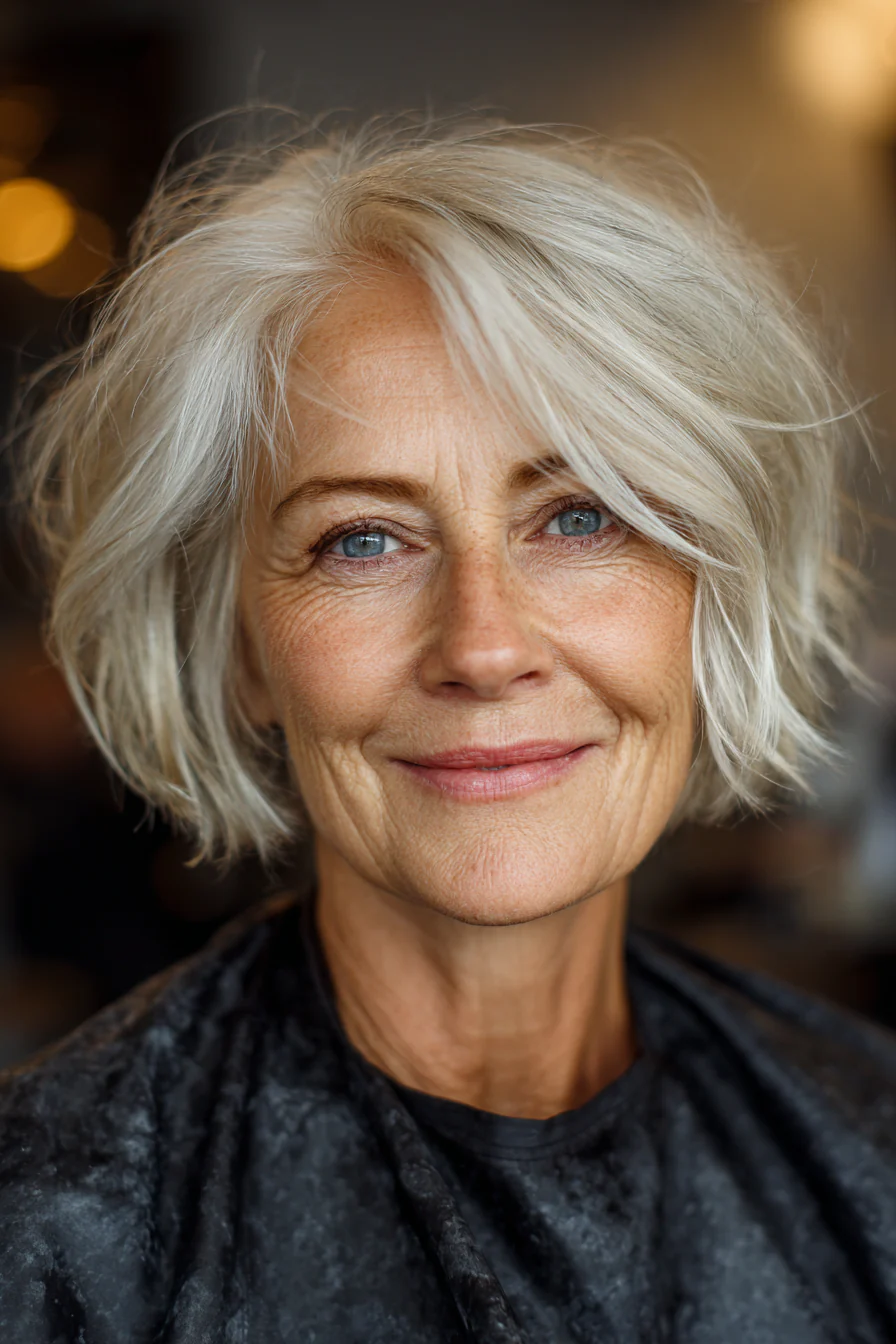 Лёгкие слои дают объём и подвижность, а длина до подбородка аккуратно обрамляет лицо. Серебристый блонд красиво «подруживает» натуральную седину с общей картинкой, оттенок получается сияющим и современным.
