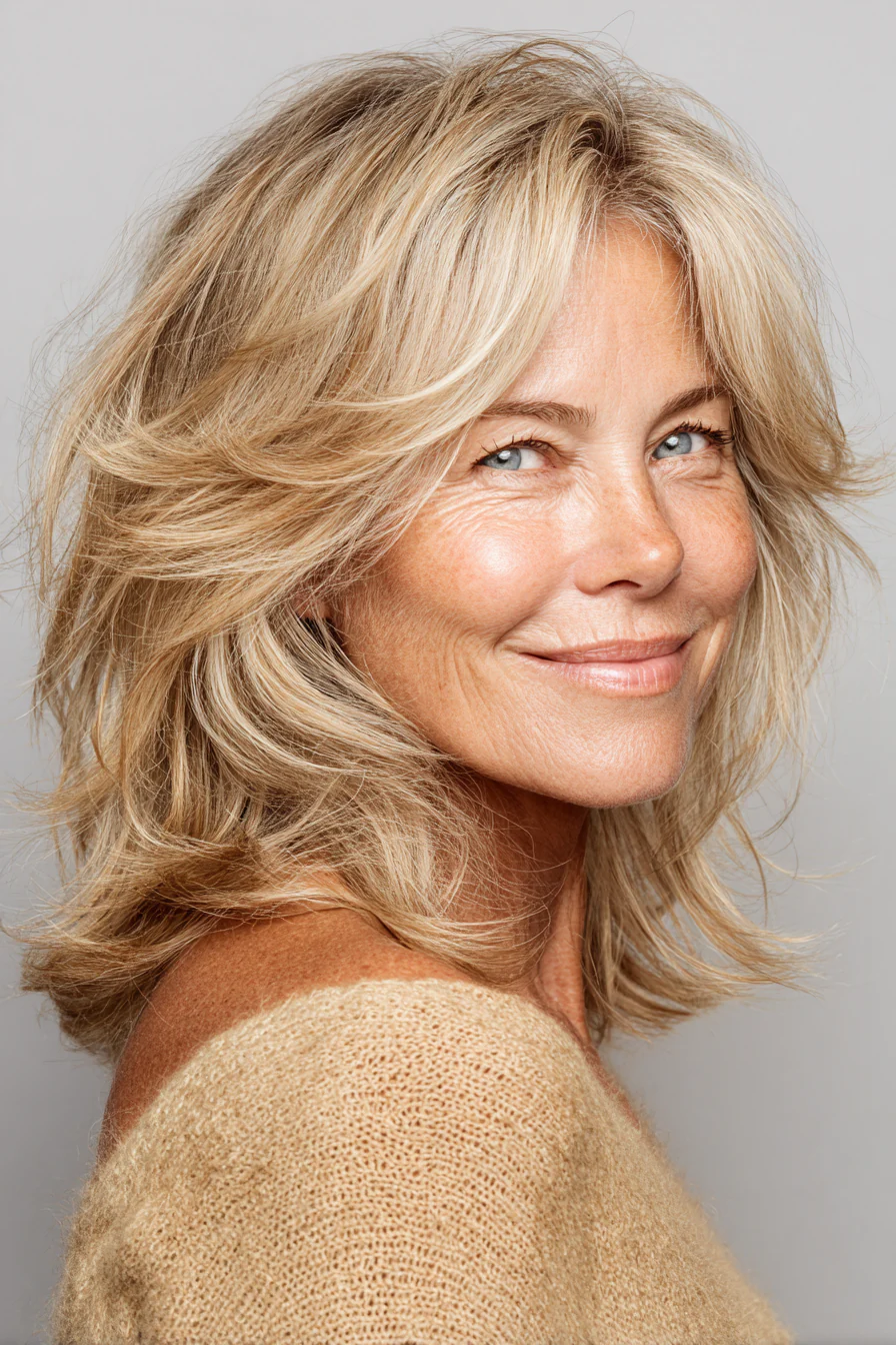 Перистые слои красиво двигаются и добавляют лёгкость, особенно в зоне лица. Золотистый блонд даёт тёплое сияние и ощущение свежести, без излишней «кукольности».