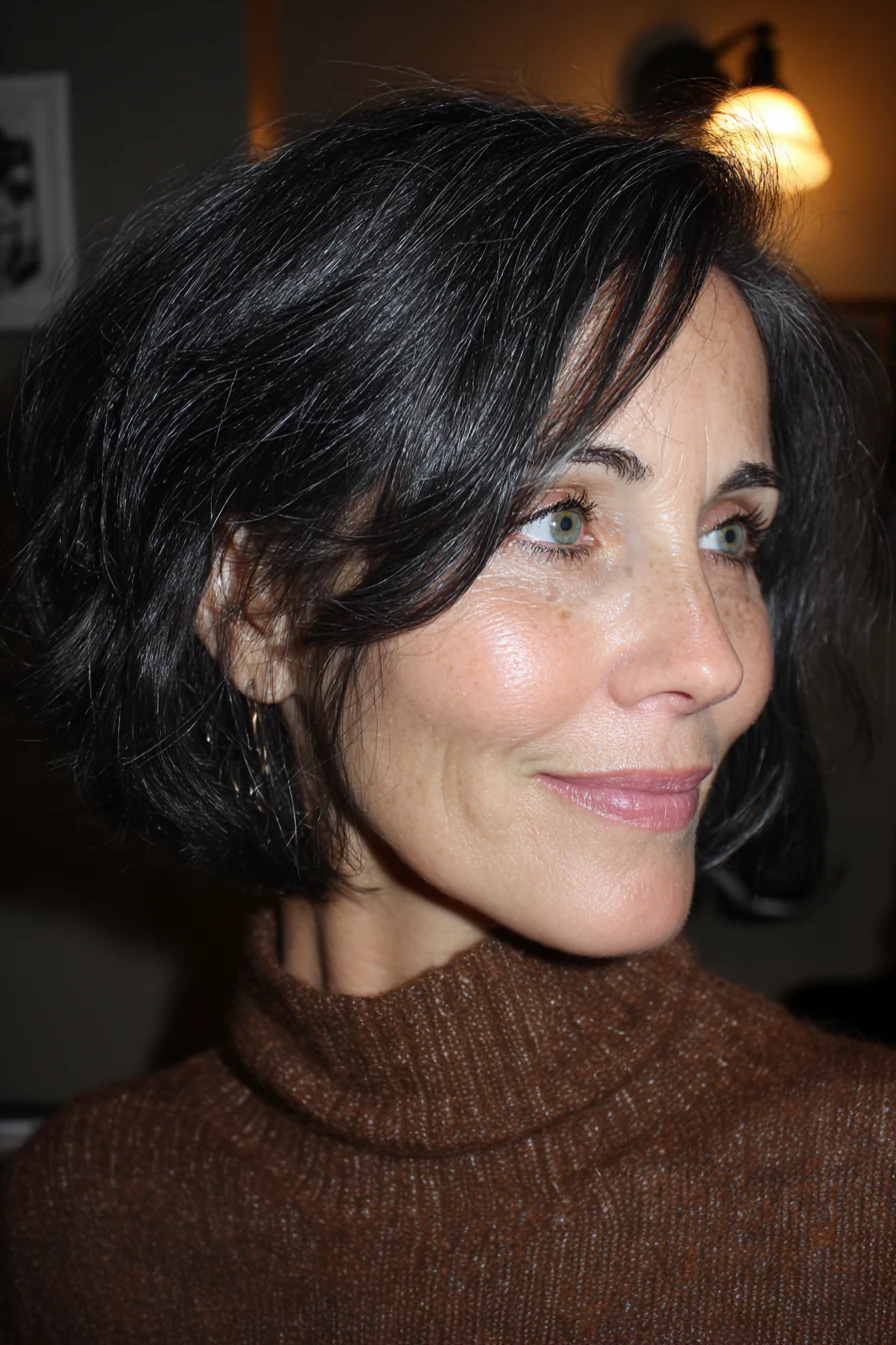 Классическая длина до подбородка и деликатные слои делают силуэт живым, но не растрёпанным. Мягкий чёрный, без выраженной синевы, добавляет блеск и контраст, при этом выглядит сдержанно.