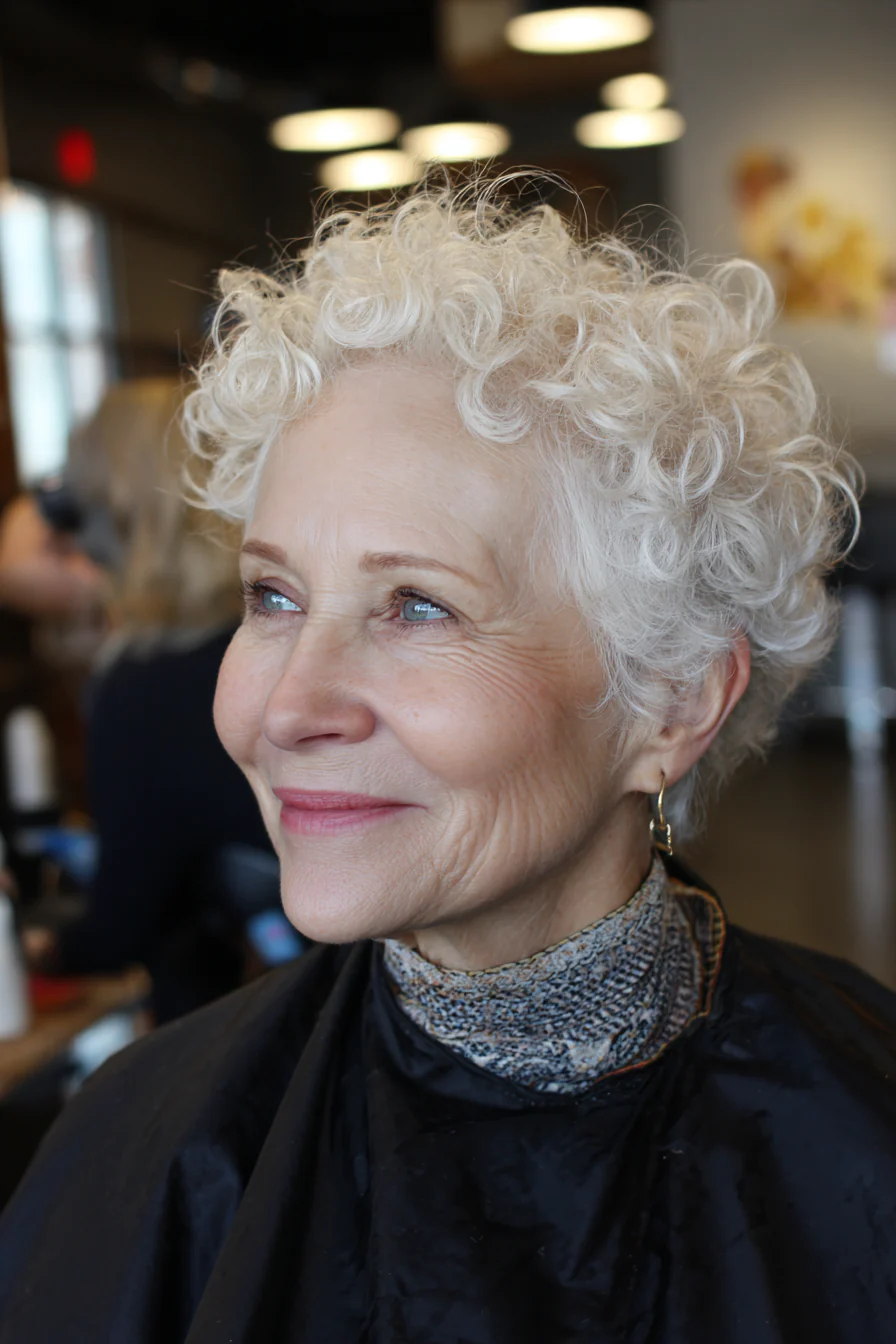 Если у вас кудри, короткая форма с объёмом на макушке часто работает лучше всего. Белая седина подчёркивает фактуру локонов, образ получается живым и динамичным.
