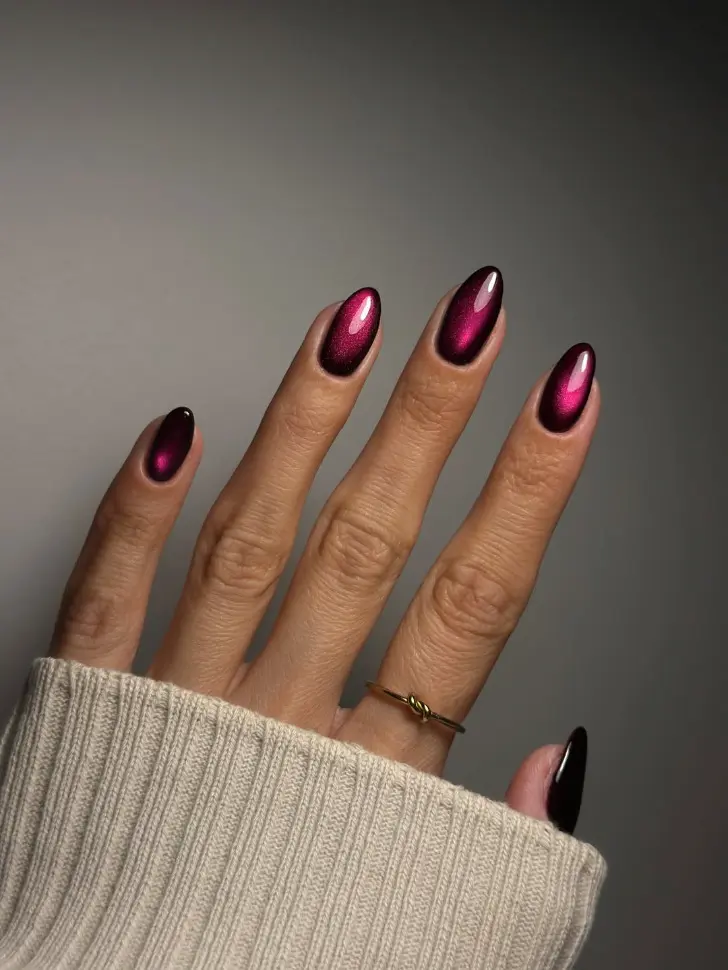 Эффект кошачьего глаза обычно ассоциируется с более вечерним настроением, но этой весной он становится тоньше. Бордовый оттенок, черная обводка и мягкий световой перелив дают глубину, но не перегружают руки. Такой маникюр хорошо подходит тем, кто любит более выразительные решения, но не хочет уходить в тяжелый дизайн.