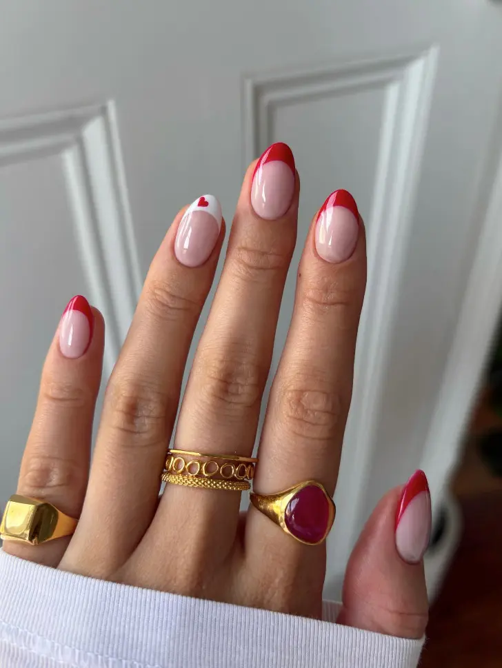 Если хочется добавить в маникюр немного настроения, но без наивности и перегруза, лучше всего работают микро-элементы. Маленькое сердечко на натуральной базе рядом с красным френчем выглядит свежо, женственно и очень аккуратно. Такой дизайн сразу считывается как весенний, но не выглядит слишком буквальным.