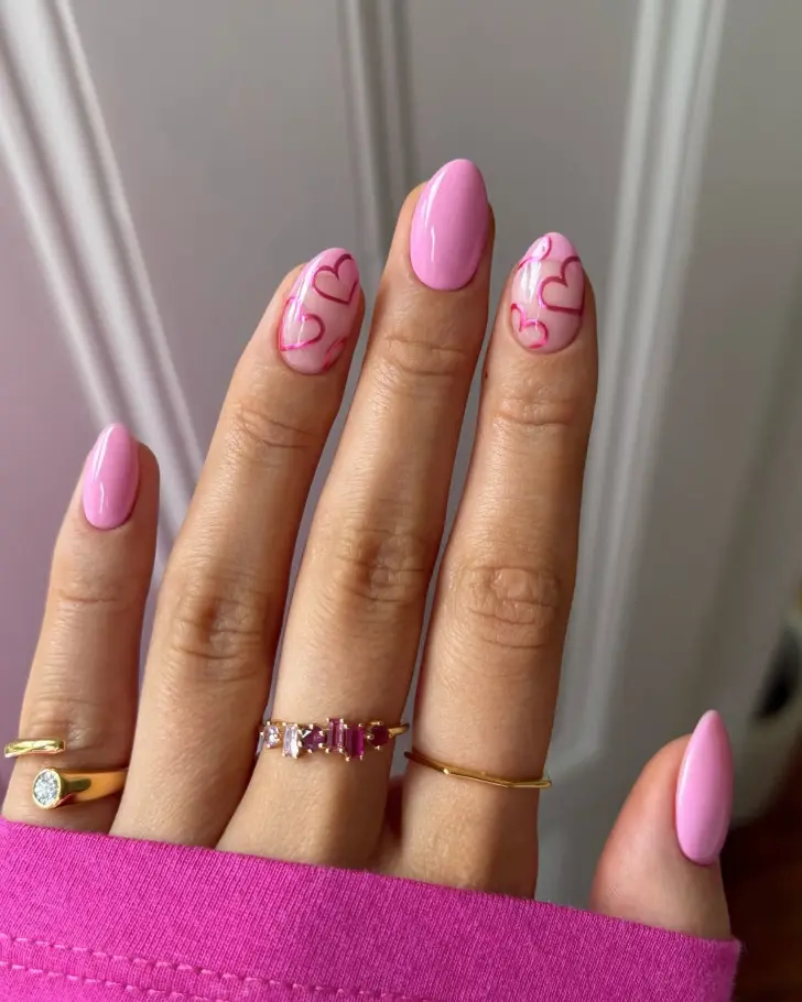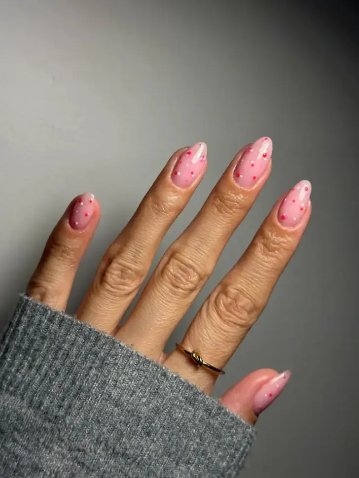 Есть оттенки, которые сложно представить неуместными, и нежно-розовый как раз из таких. Он делает руки ухоженными, не спорит с образом и всегда выглядит женственно. Если добавить к нему маленькие сердечки, получится дизайн с очень мягким настроением: деликатный, свежий и по-настоящему весенний.