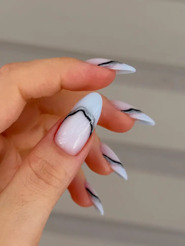 Холодная палитра весной никуда не исчезает, просто становится мягче. Молочная база, серебристая линия, тонкая черная волна, и перед нами маникюр, который выглядит собранно, современно и очень чисто. Это хороший пример того, как холодные оттенки могут смотреться не строго, а изящно.