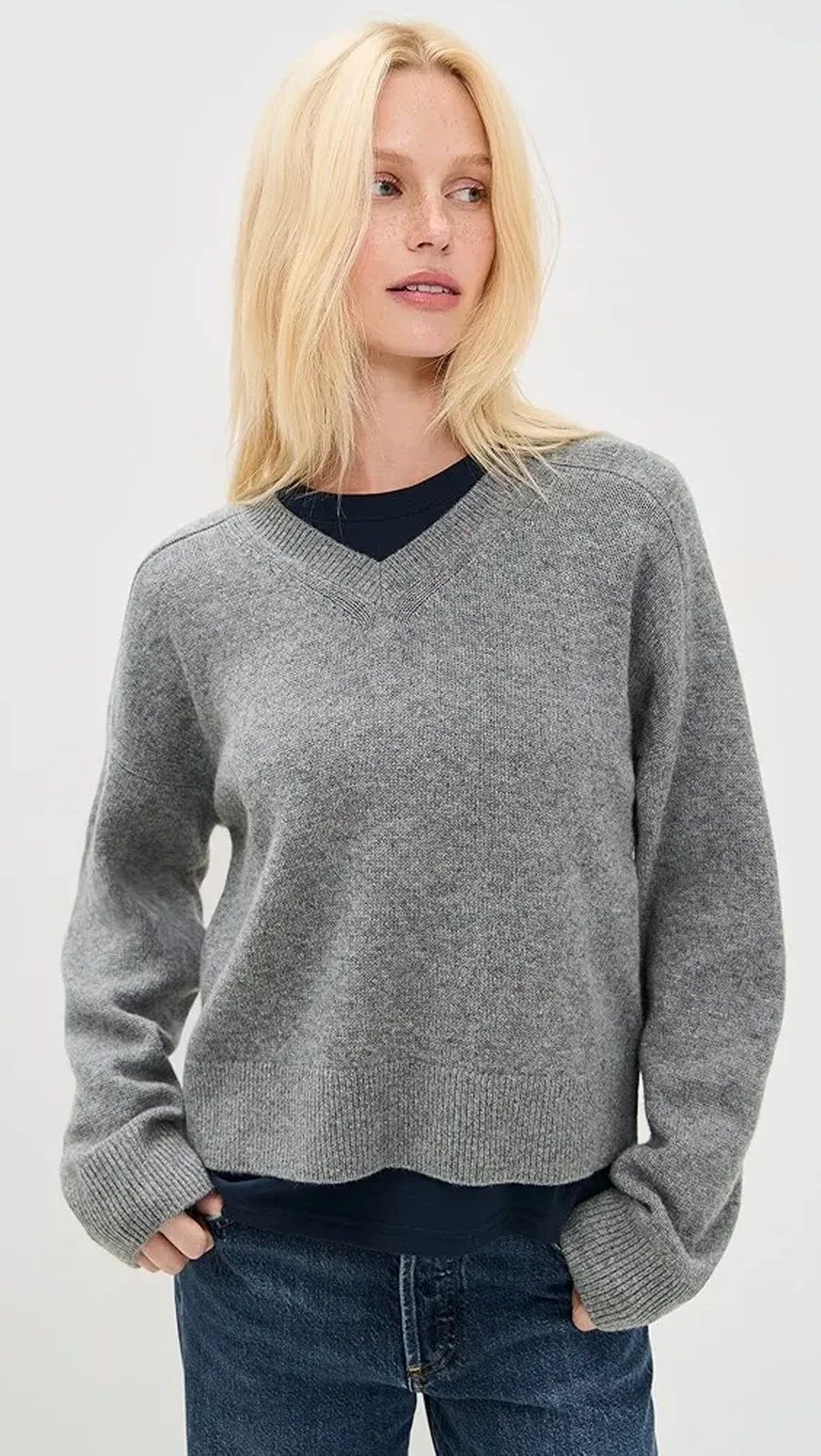 Особая привлекательность такого сочетания в том, что оно подходит практически к любому фасону джинсов, которые сейчас в тренде. Прямые модели, слегка расклешённые варианты или свободные широкие джинсы - все они выглядят заметно элегантнее, если дополнить их мягким серым пуловером.