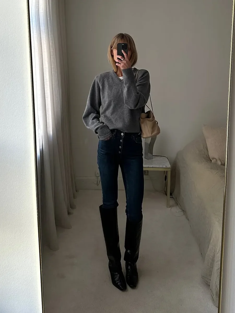 Модные эксперты отмечают, что серая мягкая пуловерная кофта в сочетании с джинсами стала одним из самых универсальных и изящных образов сезона. Этот дуэт выглядит расслабленно, но при этом утончённо - идеальный баланс между комфортом и стилем.