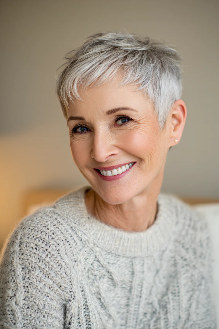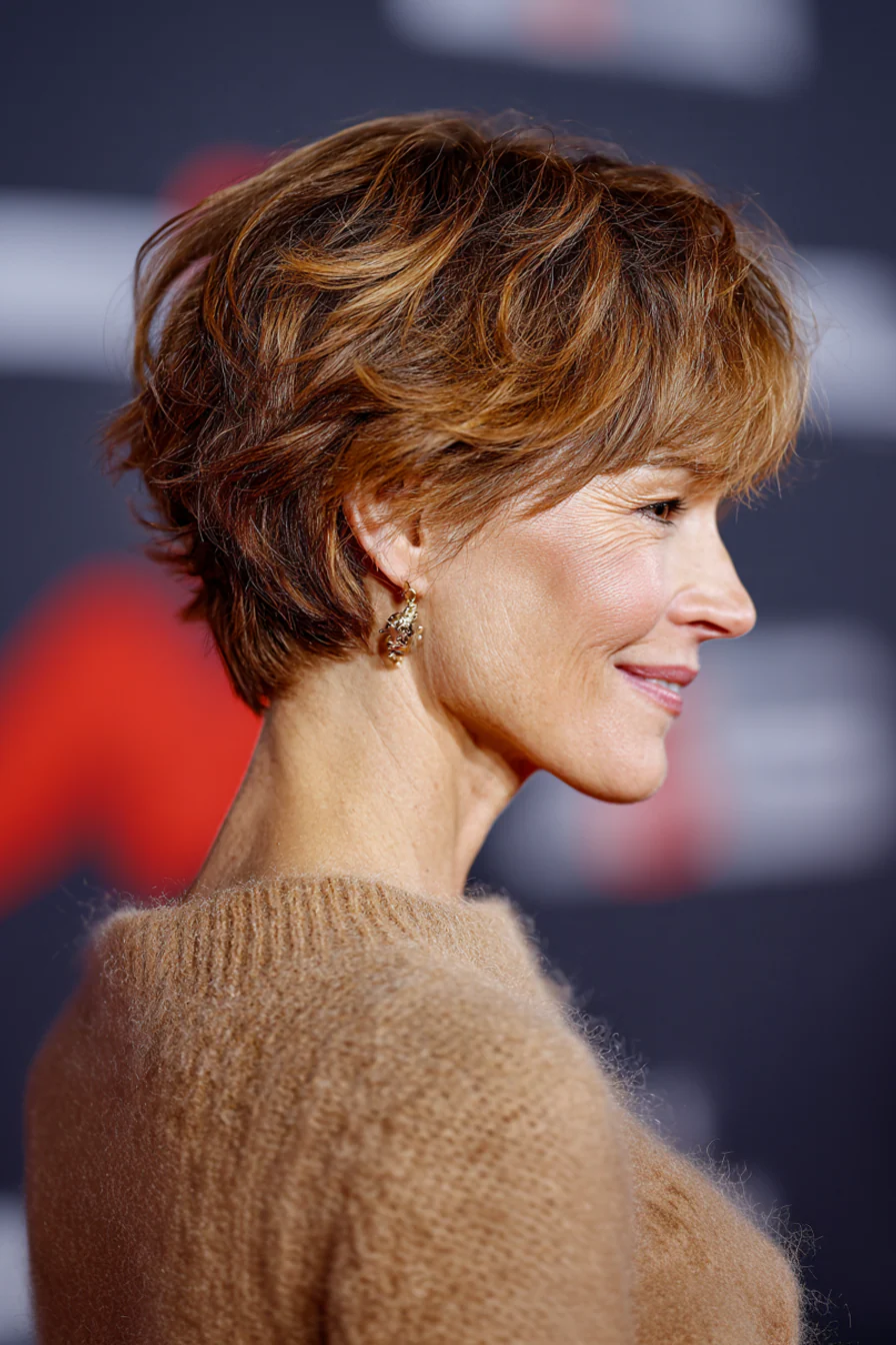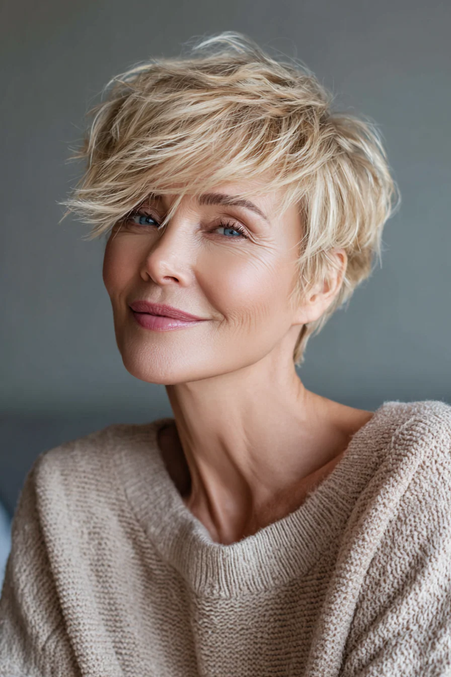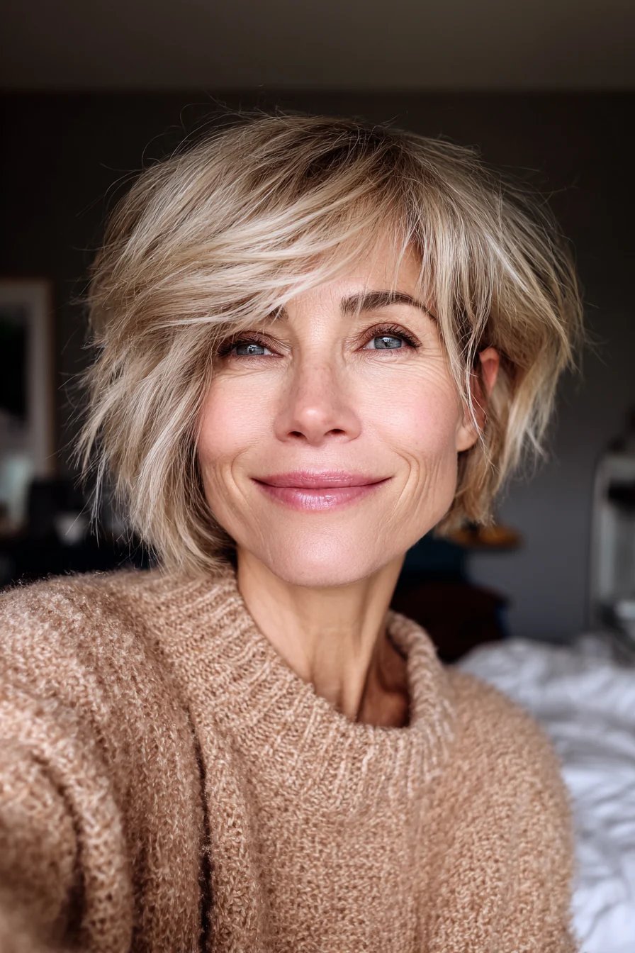 Форма соединяет плотность боба и подвижность пикси, поэтому макушка выглядит объемнее, а у лица сохраняется мягкость. Песочно-бежевый оттенок дает свежесть и красиво работает на омоложение, не делая образ слишком юным или нарочитым.