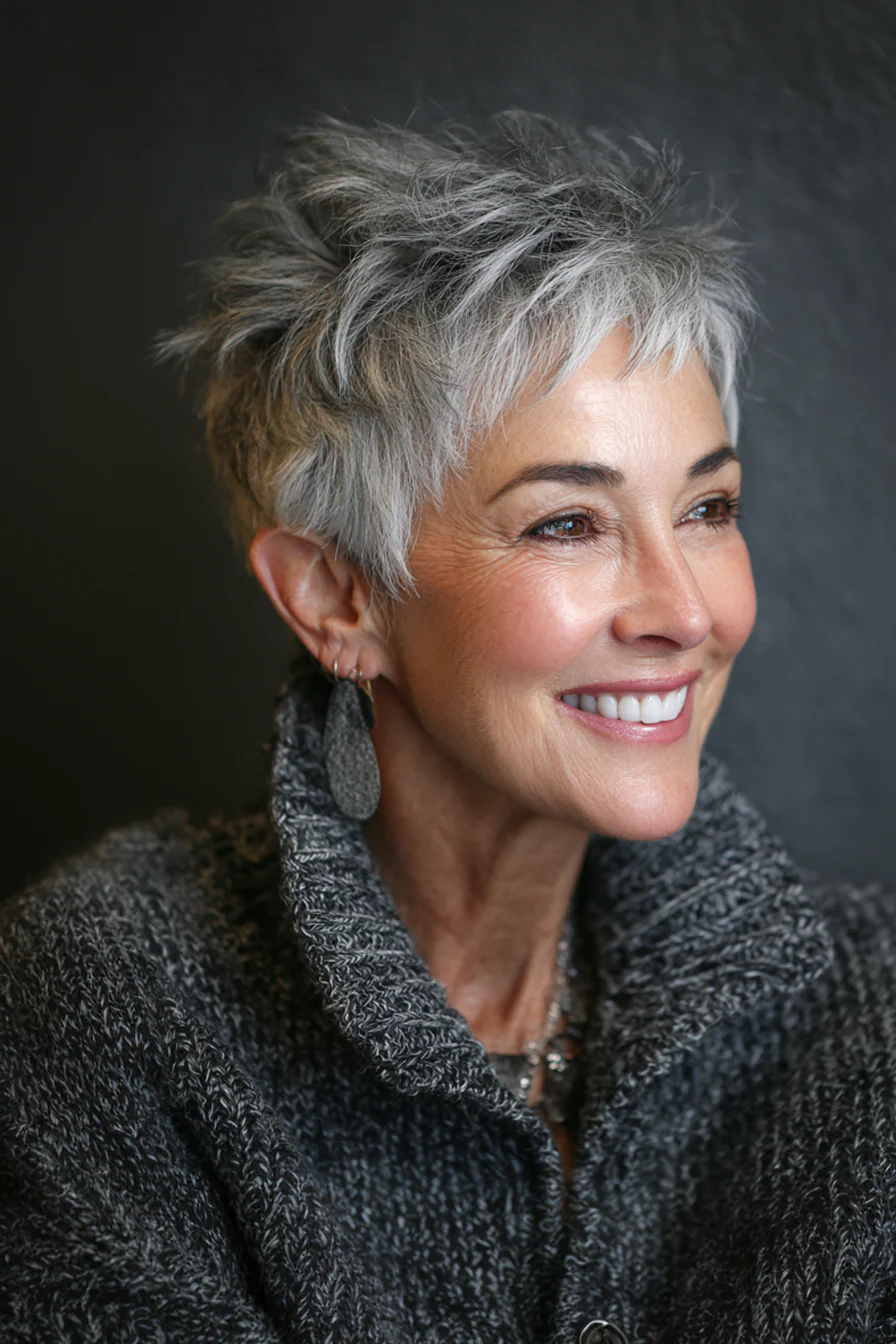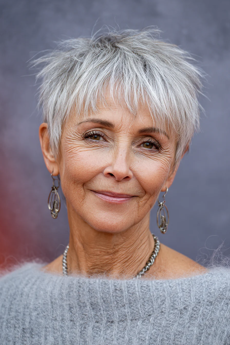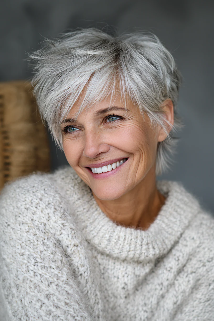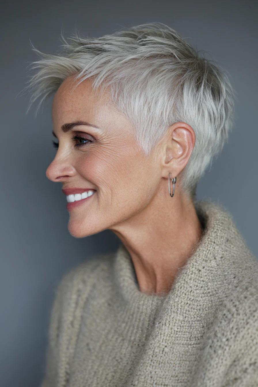 Форма соединяет плотность боба и подвижность пикси, поэтому макушка выглядит объемнее, а у лица сохраняется мягкость. Песочно-бежевый оттенок дает свежесть и красиво работает на омоложение, не делая образ слишком юным или нарочитым.