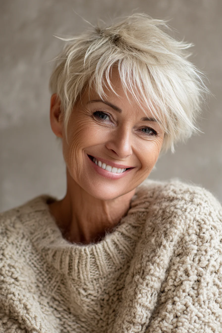 Короткие слои создают высоту у макушки, и именно это дает выраженный омолаживающий эффект. Платиново-серебристый оттенок добавляет свет, а значит, визуальной плотности и современности.