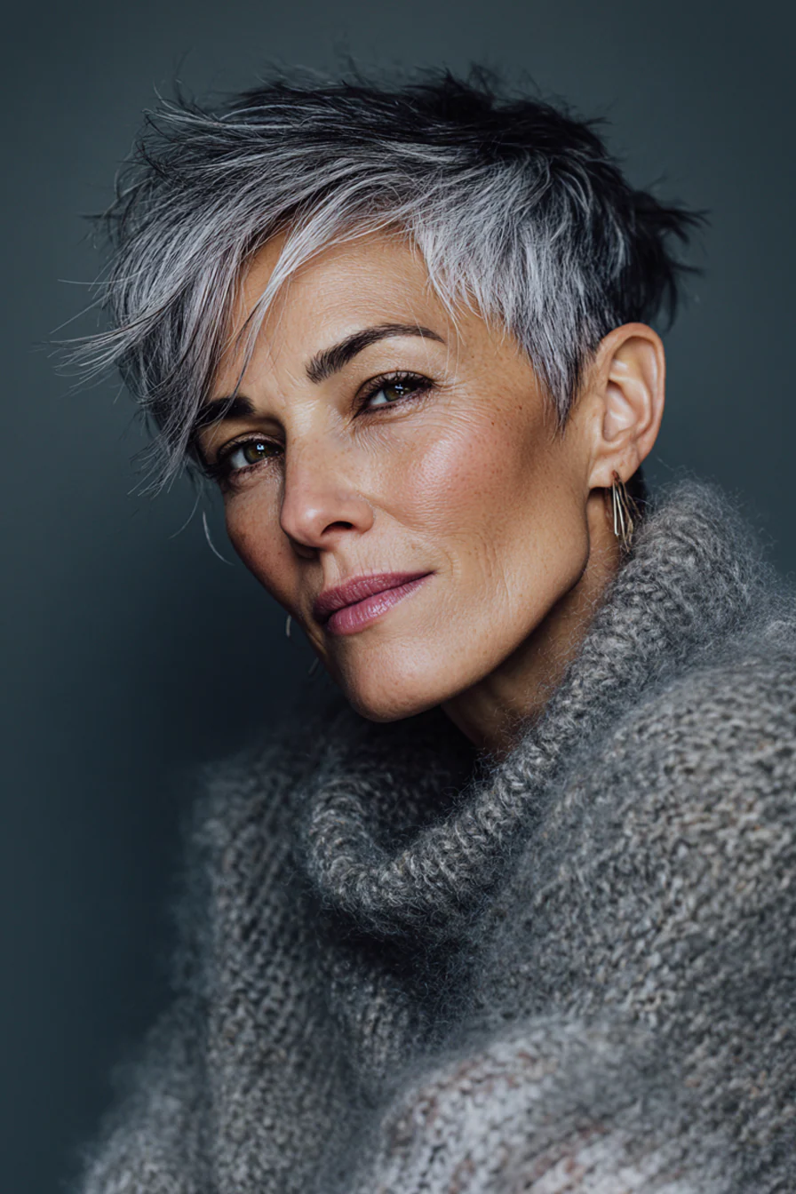 5. Пикси с коротким затылком и объемной макушкой в оттенке соль с перцем