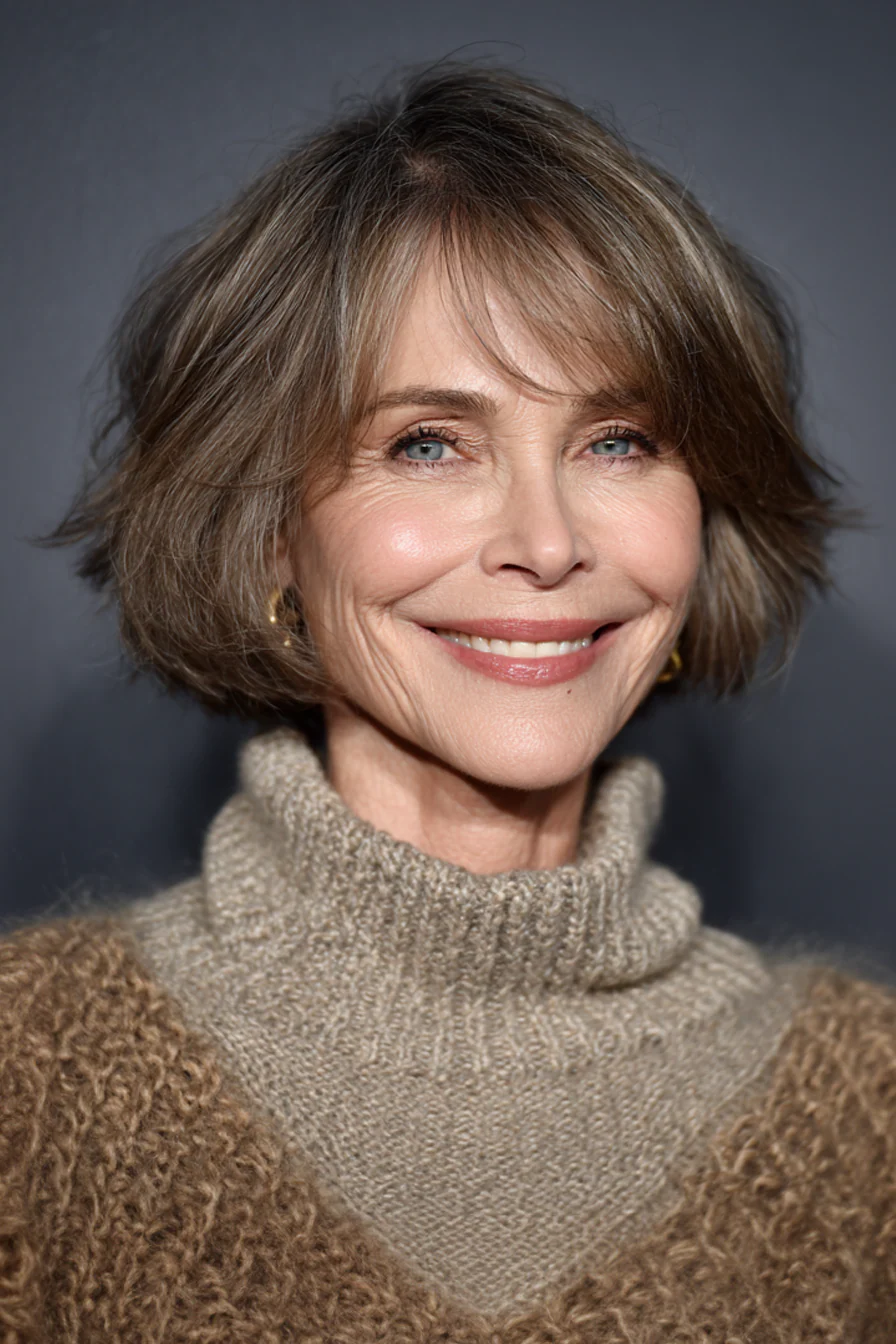 Натуральный теплый шатен делает эту стрижку особенно универсальной и носибельной. За счет деликатных слоев появляется естественный подъем у корней, а весь образ выглядит собранным, современным и моложе.