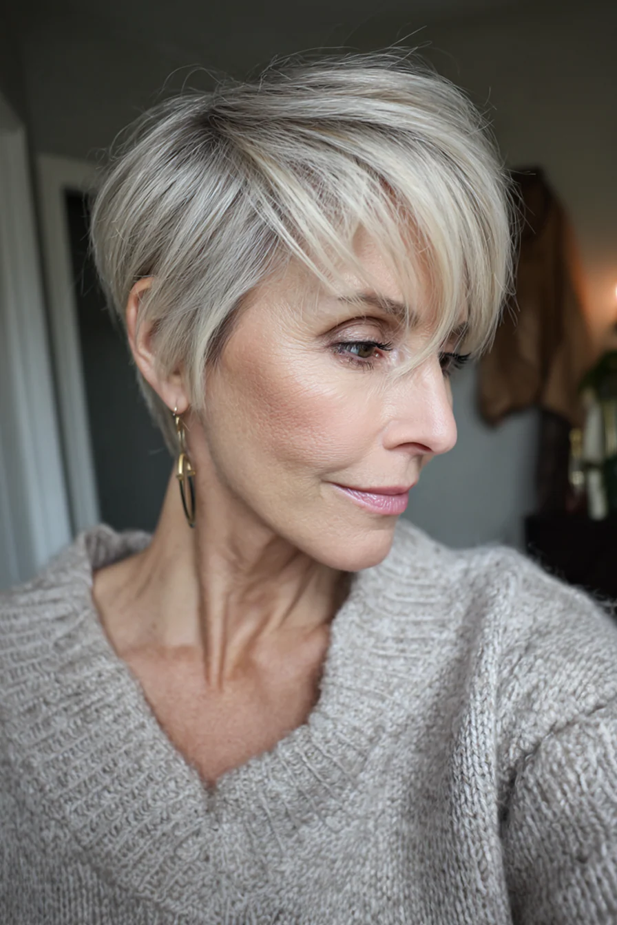 9. Пикси с глубоким боковым пробором и серебристыми акцентами