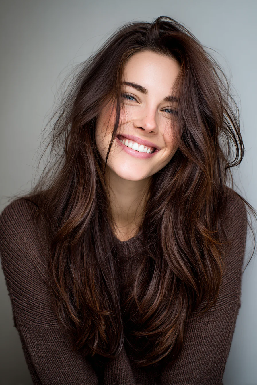 10. Длинные волосы с мягкими слоями в оттенке тёмный шоколад
