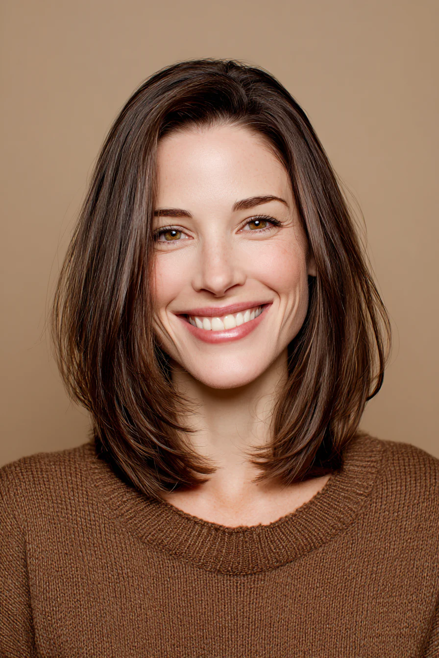 Если длину жалко срезать, часто достаточно грамотно её обновить. Мягкие слои добавляют движения, а оттенок тёмный шоколад делает волосы блестящими и визуально более плотными.