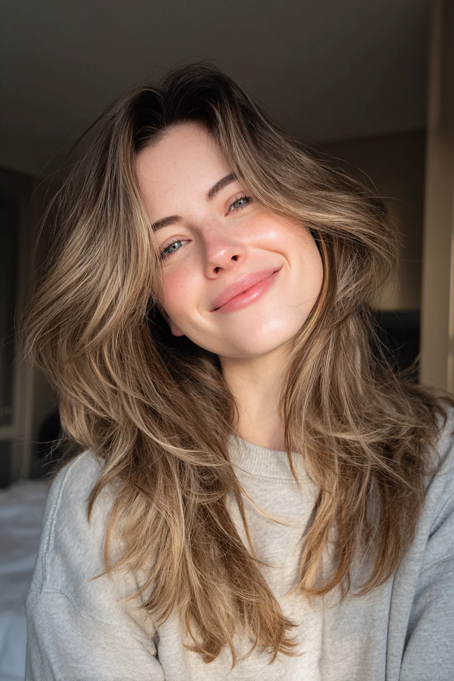 15. Длинные слои с прядями у лица и мягким балаяжем