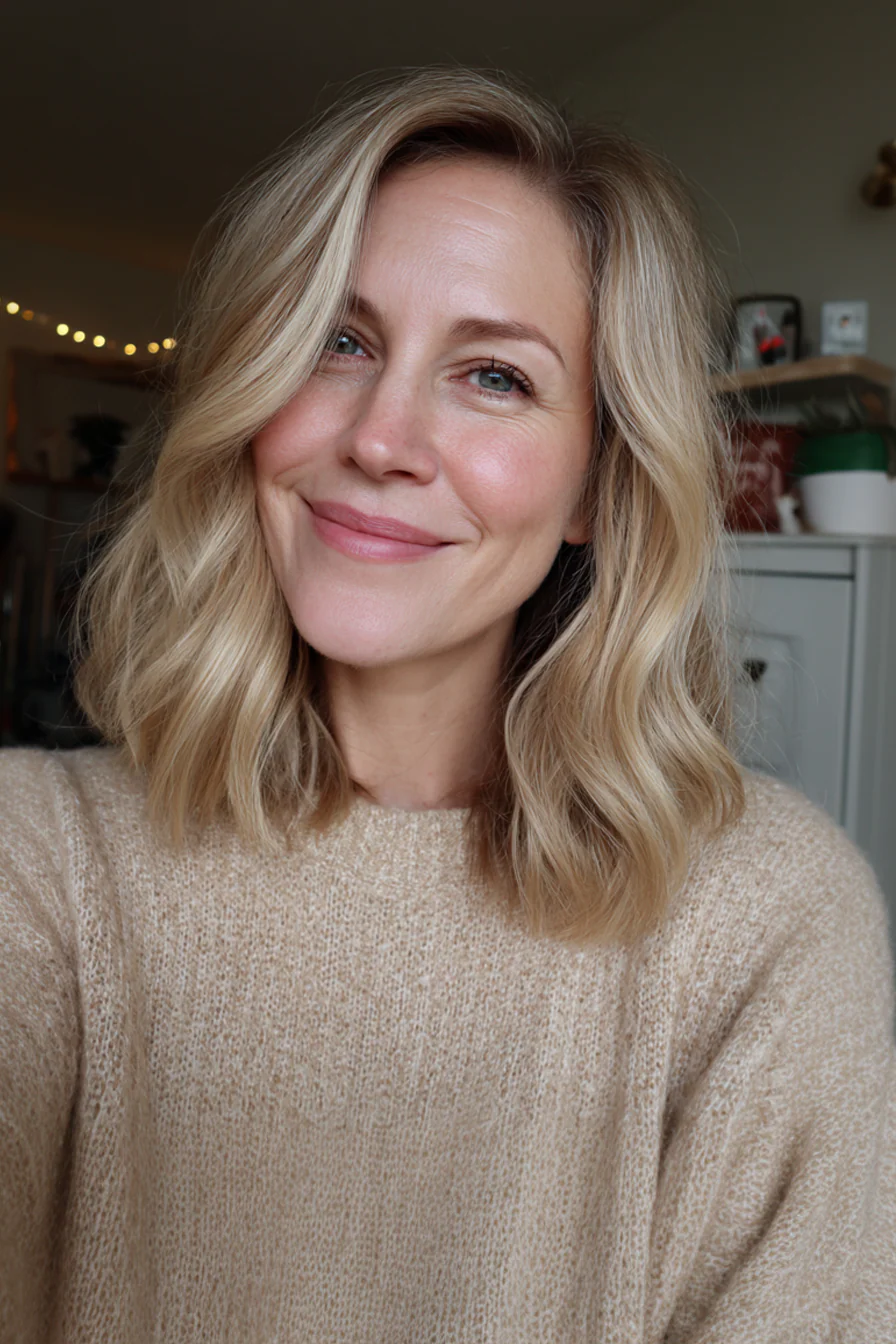 Один из самых простых способов освежить привычную длину. Пряди у лица смягчают черты, а мягкий балаяж создаёт эффект естественно выгоревших волос.