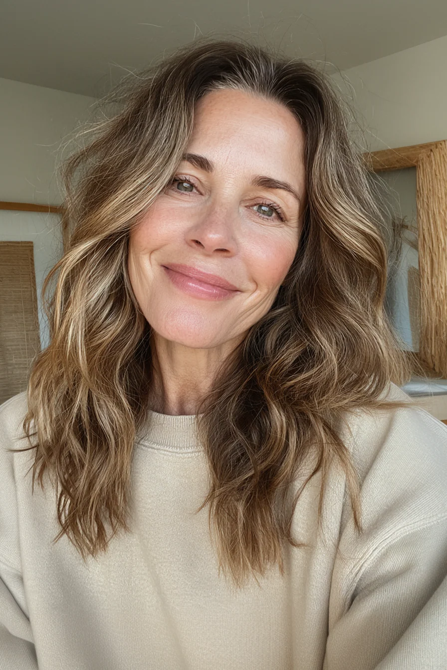 Бронд, мягкий микс русого и блонда, особенно красиво смотрится на волнах. Такая длина удобна, а цвет даёт объём и глубину без резких контрастов.