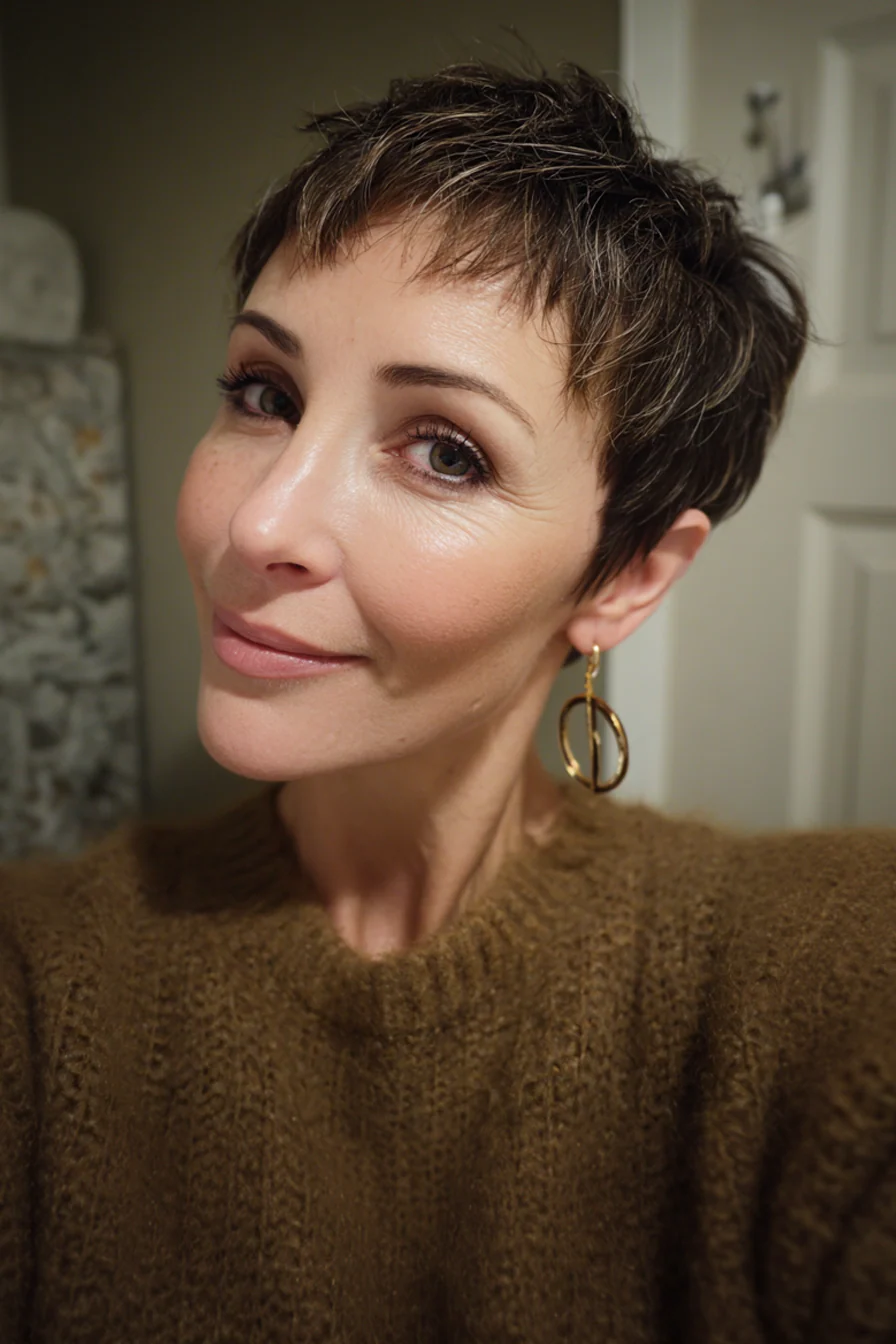 Короткая стрижка с характером, но без жёсткости. Текстура даёт объём и лёгкость, а холодный пепельно-каштановый оттенок смотрится современно и благородно.