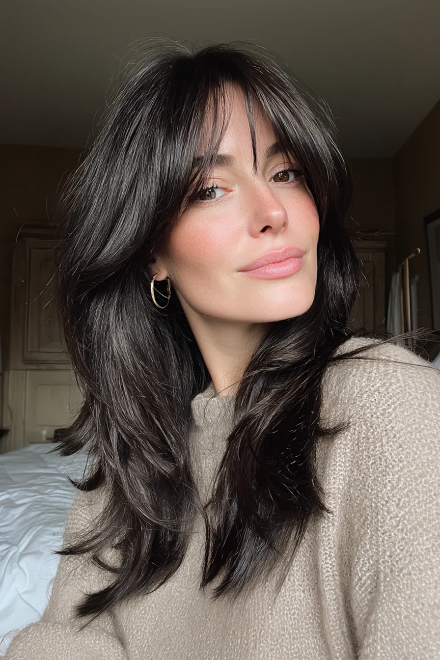 Чёлка-шторка мягко обрамляет лицо, а слои помогают волосам лежать красивее. Натуральный чёрный делает образ выразительным, но не тяжёлым.