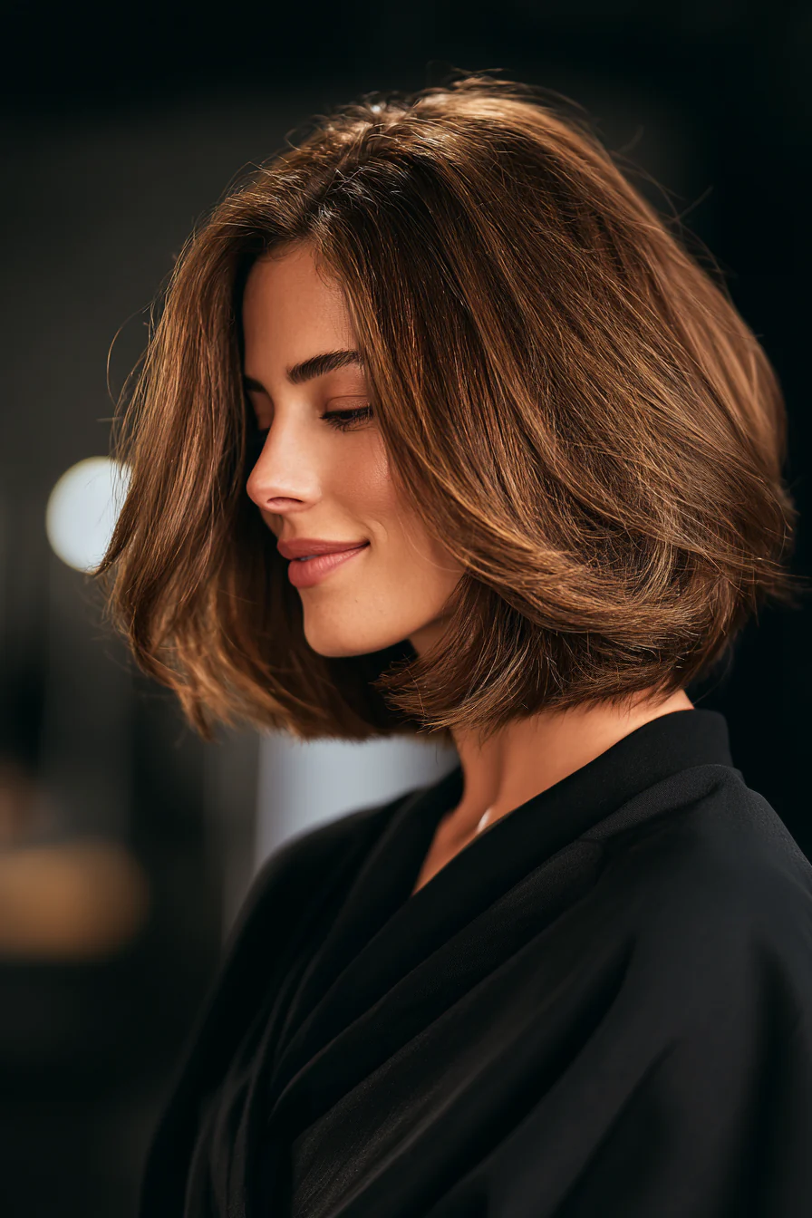 Очень удобная длина на каждый день. Чёлка-шторка делает образ мягче, а оттенок мокко выглядит дорого и спокойно.