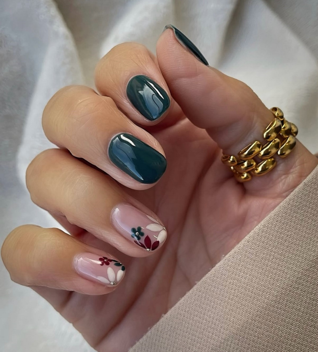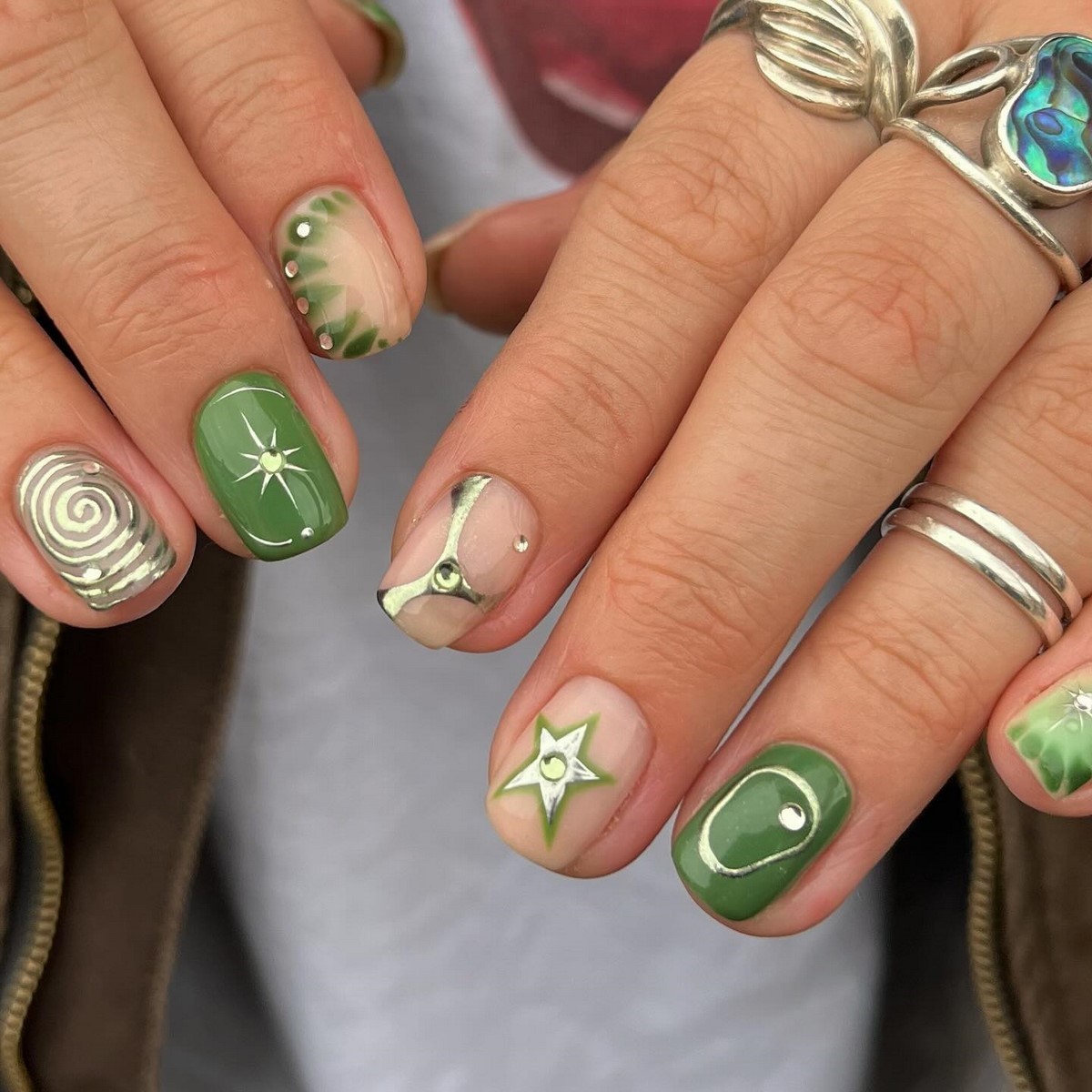 На коротких ногтях зеленая палитра дает тот самый эффект, когда маникюр заметен, но не кричит. Он освежает руки, добавляет характер и при этом не спорит ни с украшениями, ни с базовым гардеробом.
