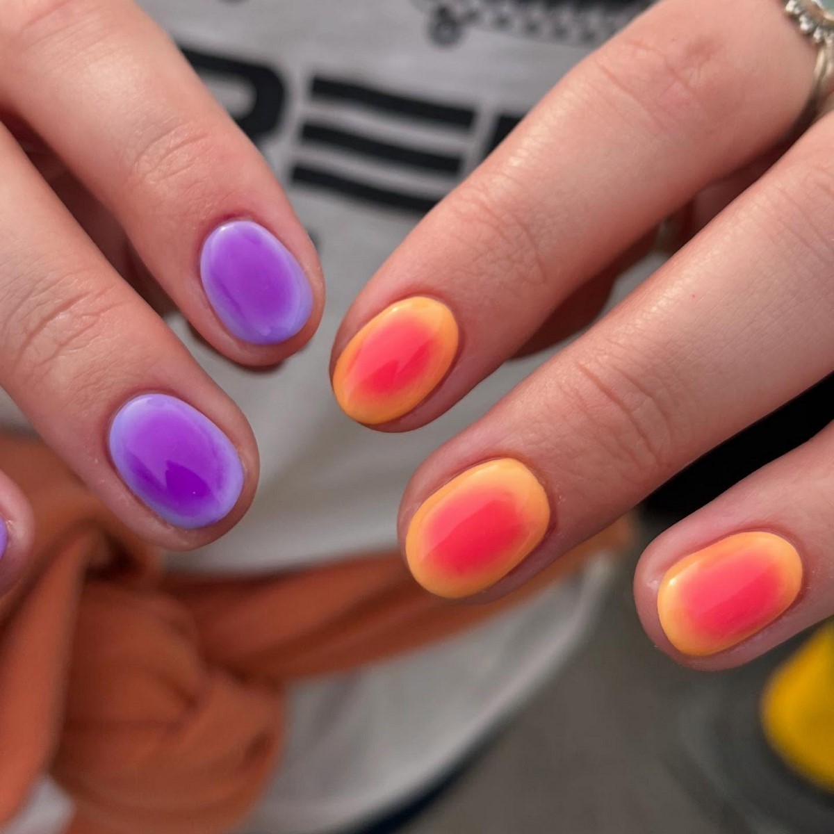 Аура-маникюр в апреле не исчезает, а становится мягче. Без резких контрастов, без кислотных пятен, без тяжелого центра. Сейчас лучше всего смотрятся плавные переходы, будто ноготь подсвечен изнутри.