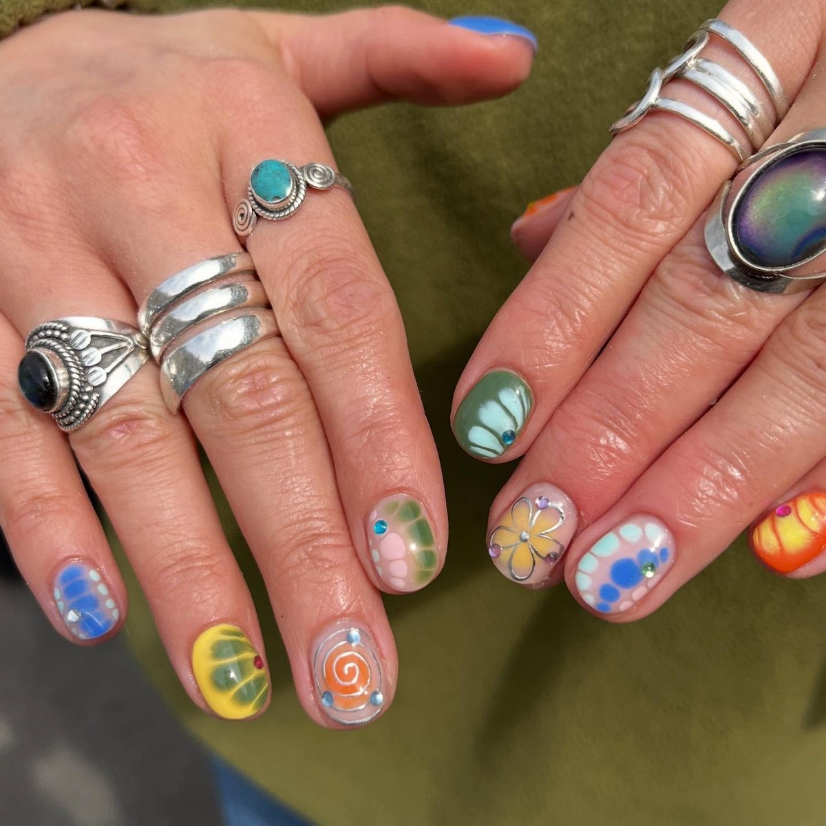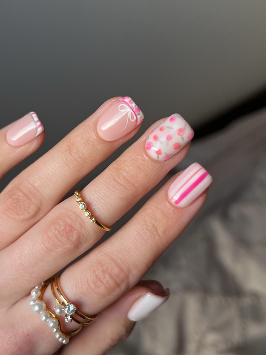 Разный дизайн на каждом ногте легко уводит маникюр в хаос. Но если держать одну палитру и одну идею, эффект будет совсем другим. Mix and match на короткой длине выглядит свежо, когда все собрано в единый ритм: один ноготь глянцевый, другой с легким шиммером, третий с едва заметным акцентом.