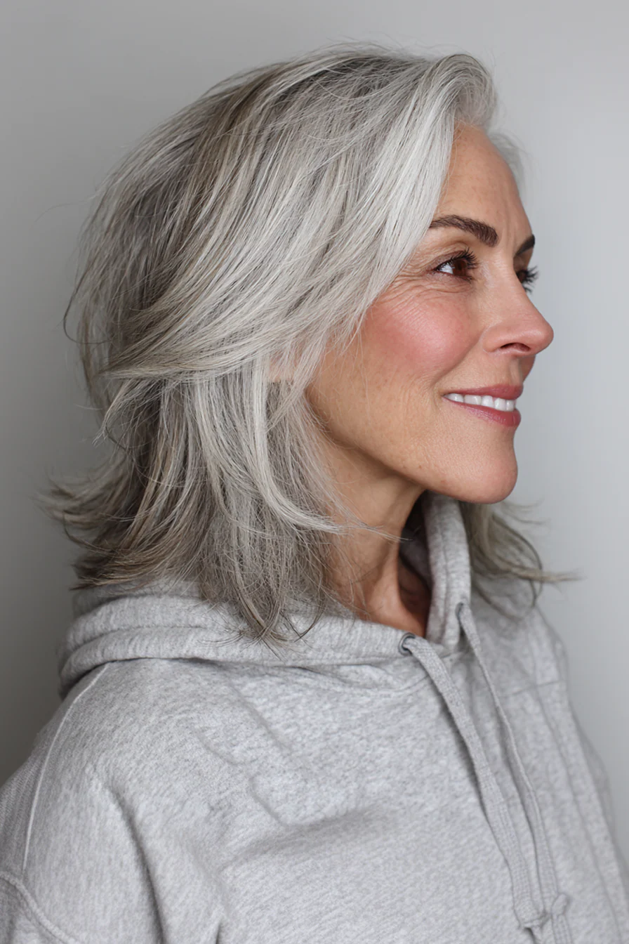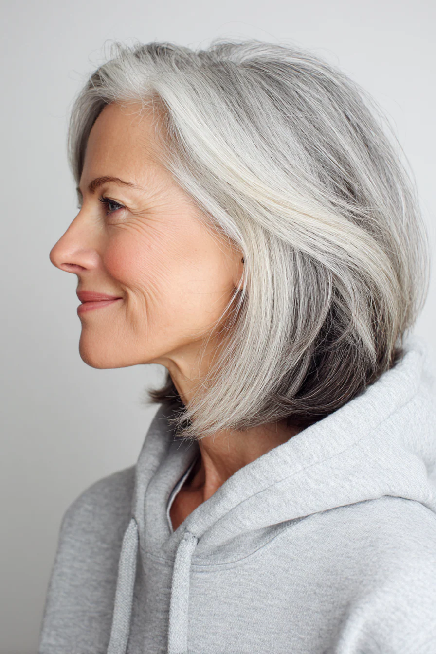 Это один из самых элегантных вариантов для тех, кто решил не прятать седину, а красиво встроить её в образ. Мягкие слои добавляют форме живость, а плавный переход по цвету делает всё аккуратным и дорогим на вид.