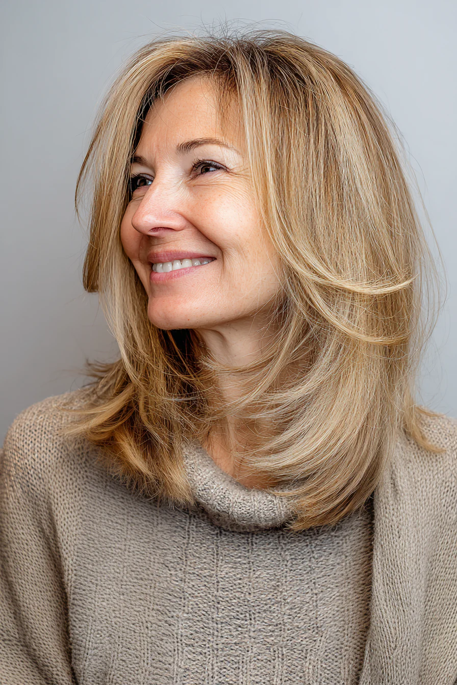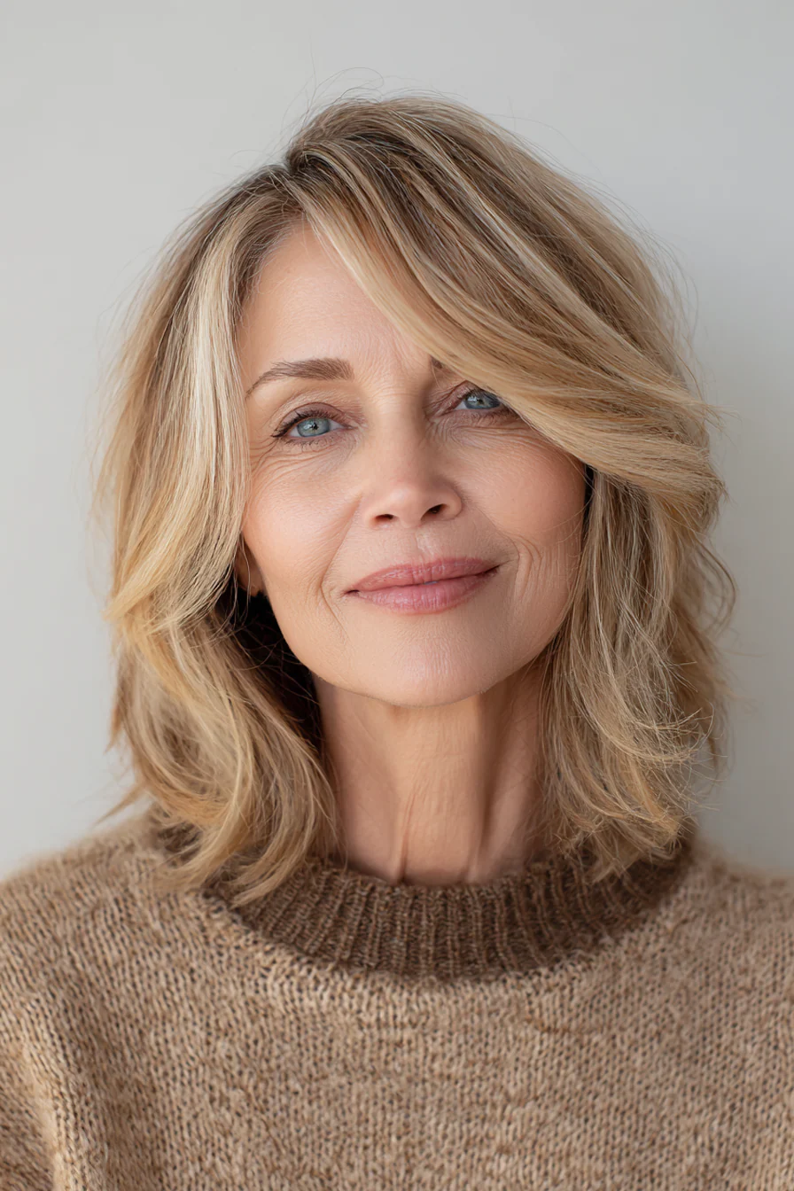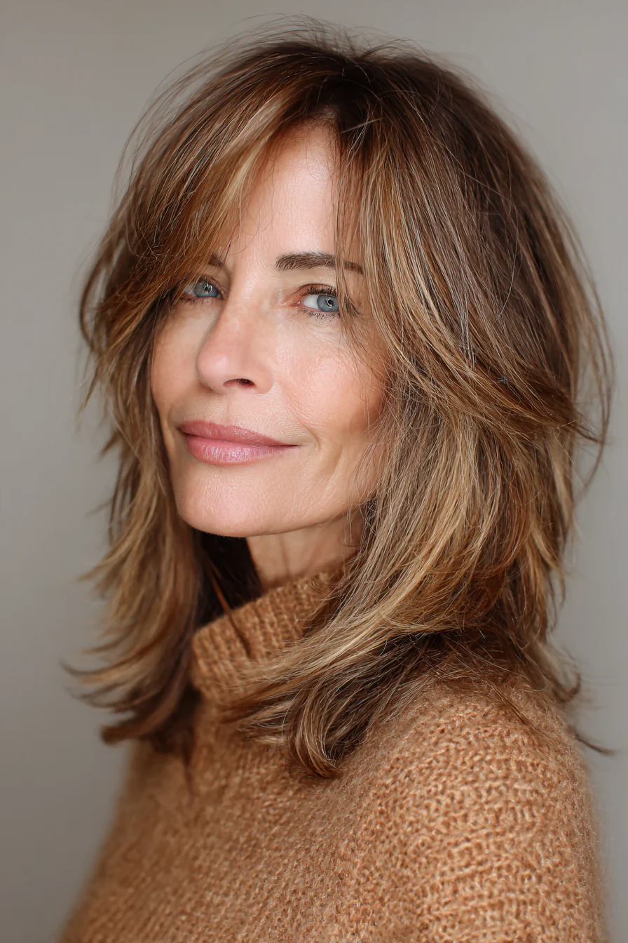 После 50 волосы часто меняют характер: могут стать тоньше, суше, менее послушными и быстрее терять объём. Именно поэтому средняя длина со слоями остаётся одним из самых удачных решений: она освежает лицо, возвращает форму и помогает волосам выглядеть живыми без лишних усилий.