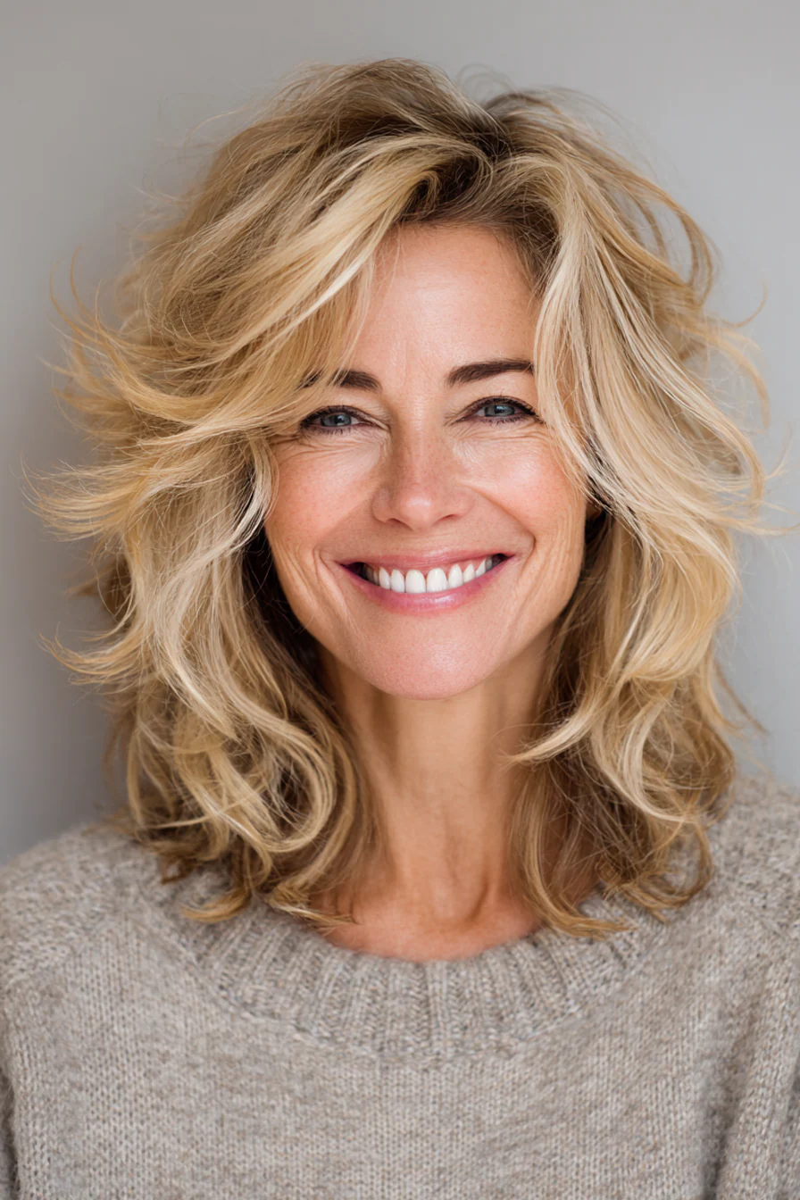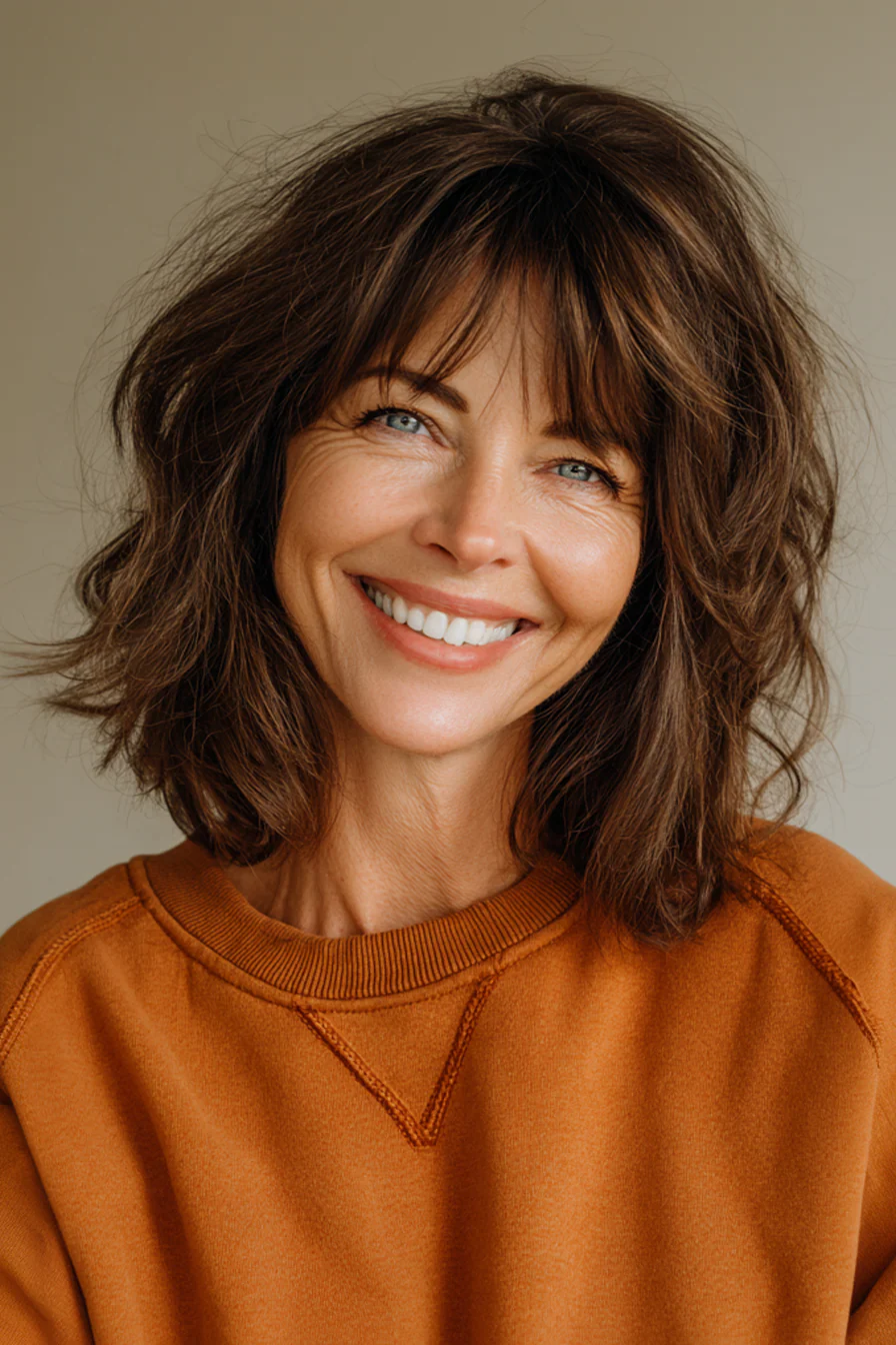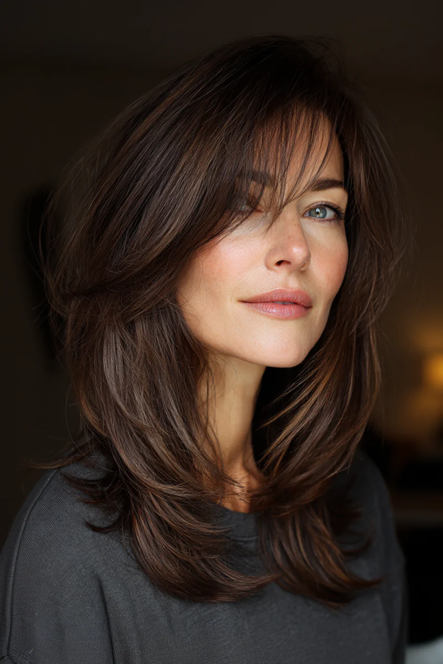 После 50 волосы часто меняют характер: могут стать тоньше, суше, менее послушными и быстрее терять объём. Именно поэтому средняя длина со слоями остаётся одним из самых удачных решений: она освежает лицо, возвращает форму и помогает волосам выглядеть живыми без лишних усилий.