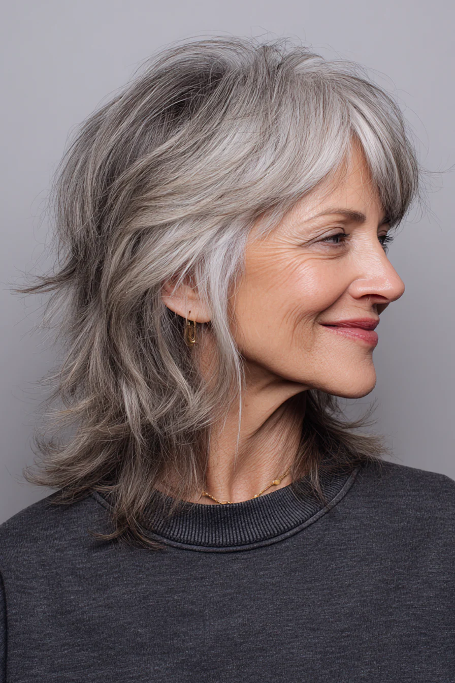 Шэг с рваными слоями и чёлкой-шторкой даёт расслабленный, современный объём. Естественное сочетание седых и тёмных прядей выглядит благородно и избавляет от ощущения слишком «сделанного» цвета.