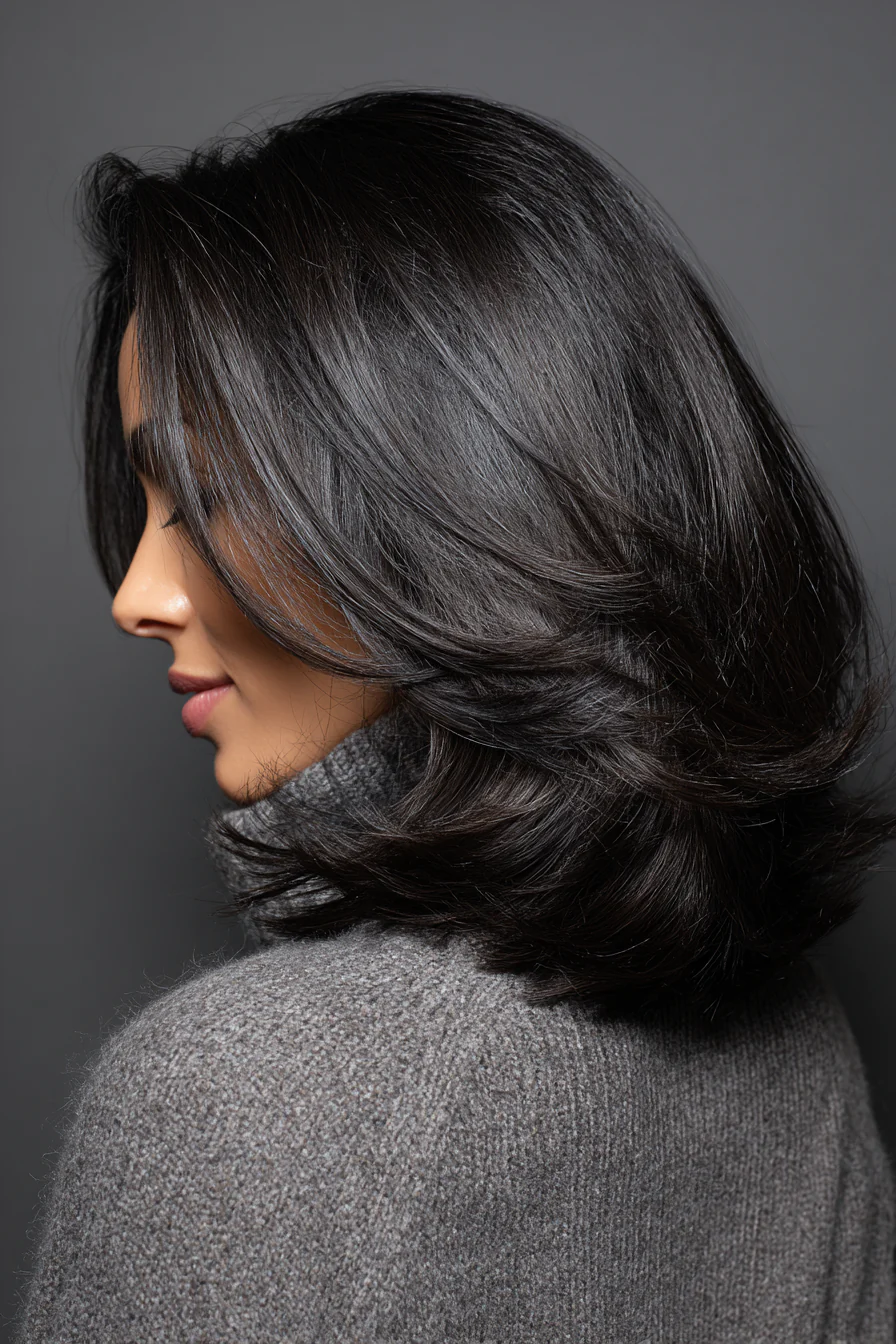 Чистая форма лоба всегда выглядит собранно, а деликатные внутренние слои не дают длине лежать тяжело. Мягкий чёрный оттенок смотрится глубоко, но не делает черты жёстче, что особенно важно для гармоничного образа после 50.