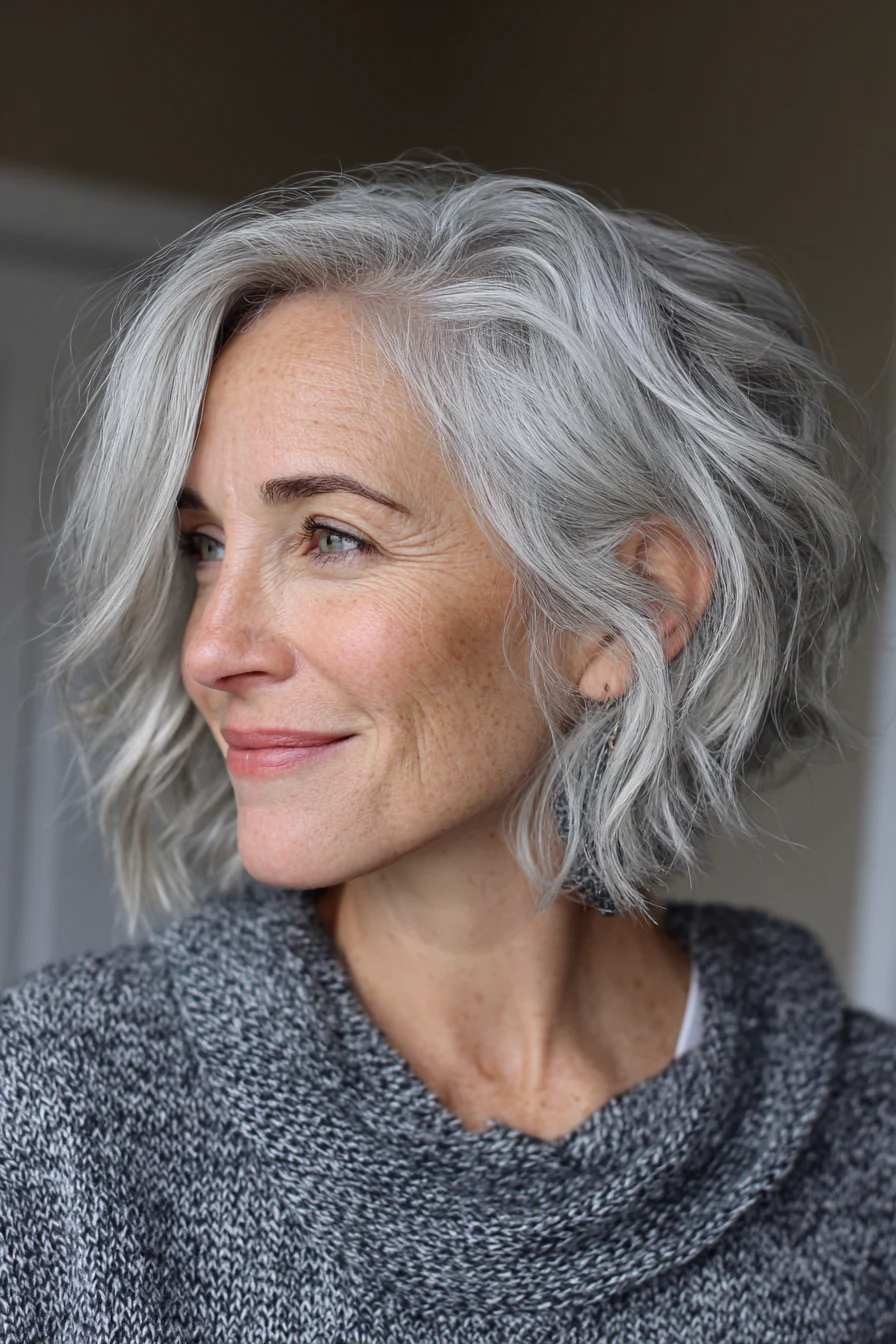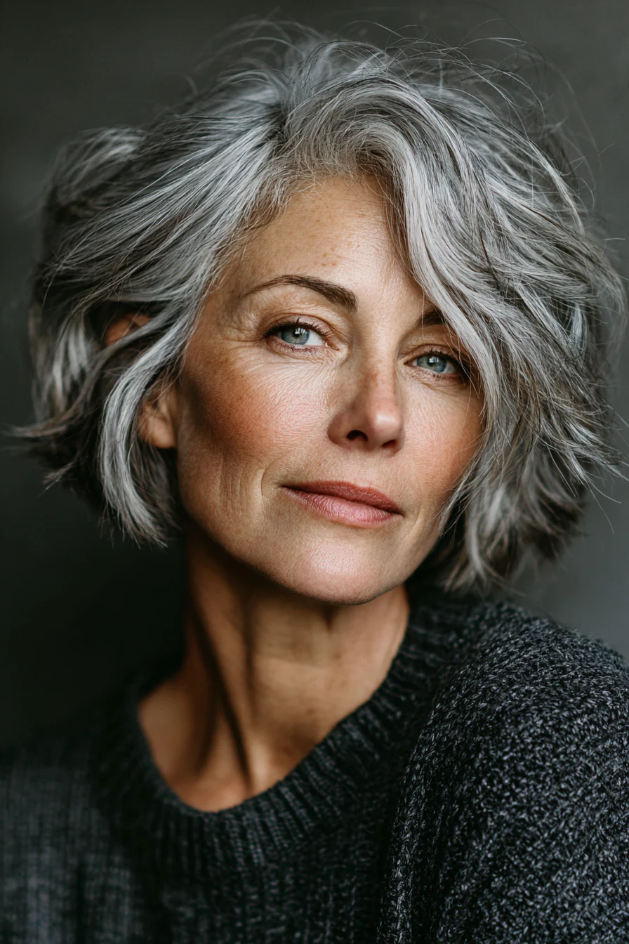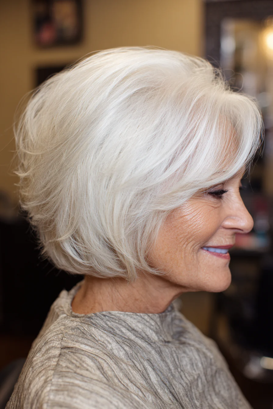 Мягкие слои делают форму живой и не дают волосам лежать плоско. Боковой пробор помогает приподнять корни, а натуральный серебристый оттенок делает образ благородным и свежим.